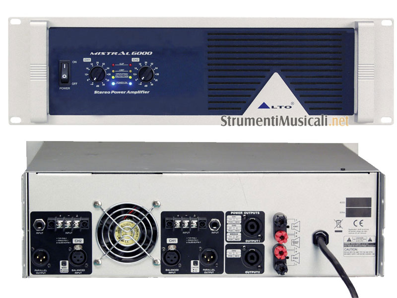 La serie MISTRAL della ALTO è una linea di amplificatori professionali di alta potenza, basso profilo, con caratteristiche evolute e di grande affidabilità. Sviluppano un'enorme potenza, fino a 2800w in bridged mono mode su 8 ohms, forniscono prestazioni di alto livello nelle condizioni più critiche. Una ventola a velocità automaticamente variabile consente il necessario raffreddamento per il calore prodotto. L'amplificatore contiene una circuitazione totalmente a stadio solido, usando apparecchi di uscita complementari in silicone. L'amplificatore è fornito con cavo di corrente pressofuso con spina adeguata per il voltaggio e l'assorbimento. L'amplificatore usufruisce di raffreddamento forzato tramite una ventola a velocità variabile a basso rumore. Il flusso dell'aria è da dietro ad avanti per evitare l'aumento della temperatura all'interno del rack. L'amplificatore contiene due canali indipendenti, con trasformatori secondari, alimentazione e protezione separati. Tutti i sistemi di protezione, tranne quello per la corrente alternata, si resettano automaticamente all'eliminazione della causa mentre l'altro canale continua a funzionare. Ogni canale ha circuiti di protezione indipendenti per circuiti aperti, corto-circuiti, carichi anomali e surriscaldamento. Ogni canale ha un led principale che diventa verde all'accensione e rosso per protezione o Mute, un altro led rosso mostra il clip reale dell'amplificatore mentre un led giallo è per lo stadio di Limiter. Le uscite adottano connettori standard e gli ingressi sono bilanciati elettronicamente e trasformatori audio di alta qualità possono essere aggiunti allo stadio d'ingresso di ogni canale.