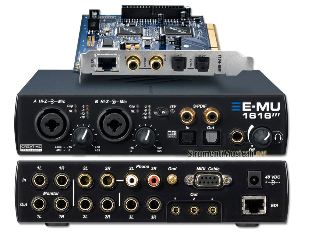 Il nuovo E-MU 1616M PCI Digital Audio System offre tutto il necessario per produrre audio su un PC con risultati professionali: convertitori 24-bit/192kHz (gli stessi convertitori A/D utilizzati nell' interfaccia HD 192 I/O), accelerazione hardware degli effetti e del mixing, opzioni di sincronizzazione completa e perfetta compatibilità con il tuo software audio/sequencer preferito. Il breakout box MicroDock M offre un totale di 16 ingressi e 16 uscite più 32 canali MIDI I/O, inclusi due E-MU XTC di Classe-A a bassissimo rumore, preamplificatori Mic/Line/Hi-Z con alimentazione phantom 48V e un morbido circuito di limitazione analogico per la protezione dei clip. La PCI 1616M inoltre viene fornita con i driver ASIO2 e WDM per Windows XP, 2000 e x64, così come con il bundle E-MU Production Software Tools che include E-MU Proteus X LE, oltre a software Steinberg, Ableton, IK Multimedia, e molto altro ancora - tutto il necessario per creare, registrare, editare, e masterizzare la propria musica.