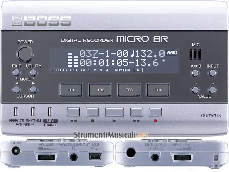 Scopri il nuovo MICRO-BR, appena più grande di un iPod, è davvero un sogno per per i musicisti "itineranti". Il MICRO-BR infatti offre quattro tracce in playback simultanee (con 32 tracce virtuali), uno slot per card SD, un processore multieffetto, una drums machine incorporata, nonchè un accordatore. Tra le caratteristiche di spicco bisogna ricordare la presenza della porta USB per l'interscambio dati con il PC e la compatibilità del MICRO-BR con il formato MP3. Il MICRO BR è così piccolo che potrete metterlo in tasca! Misura 136mm x 81mm x 21.4mm ma nonostante le dimensioni ridotte MICRO BR offre le potenzialità di uno studio. E' facilissimo da usare grazie ai semplici controlli da pannello e al microfono ad alta qualità incorporato. MICRO BR permette di mandare in playback simultaneo 4 tracce e di poter registrare 2 tracce contemporaneamente grazie a 2 input. Ma MICRO BR offre molto di più! Potrete registrare fino a 8 V-Tracks per ogni traccia principale (per un totale di 32) in modo da poter scegliere nel vostro mix finale il materiale migliore. Tenendo conto delle piccole dimensioni e del prezzo ridotto, rimarrete stupefatti dalle caratteristiche del MICRO BR. Sono presenti più di 300 pattern ritmici che potrete utilizzare per esercitarvi o creare le vostre canzoni. I pattern ritmici suonano indipendentemente senza occupare nessuna delle 4 tracce di registrazione. Troverete anche un potente processore multi-effetto che vi offrirà Amp modeling, Compressore e Delay che vi permetteranno di arricchire le vostre registrazioni. E' inoltre possibile cambiare il tempo dei vostri MP3 e WAV senza cambiarne il pitch in modo da esercitarvi in tutta tranquillità. MICRO BR dispone della funzione Center Cancel che può essere applicata sui vostri file MP3 e WAV per mutizzare la traccia di voce o di chitarra solista. MICRO BR è un registratore digitale compatto, portatile e robusto. Registra circa 65 minuti di musica in modalità mono direttamente su una SD (Secure Digital) Card da 128MB inclusa nella confezione. Potrete utilizzare anche SD Card di capacità superiore fino a 1GB.