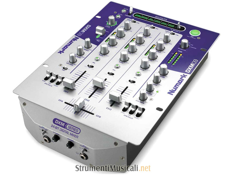 Il DXM09 è un mixer 3 canali + mic 100% digitale, che garantisce una qualità audio senza paragoni. Questo mixer va ad ampliare la serie di mixer digitali a 24-bit DXM della Numark, famosa per la presenza del limiter look-ahead che previene clip e garantisce un segnale sempre pulito in uscita. Il DXM09 monta un crossfader disegnato per garantire le migliori performance in fase di mixaggio, con controllo sulla curva di dissolvenza (Slope). I 12 effetti disponibili sono sincronizzabili alla velocità in BPM delle sorgenti audio via TAP Tempo, e dispongono di controllo wet/dry e potenziometro per il controllo del parametro. Gli effetti sono applicabili in modo pre, o post fader a 6 differenti sorgenti selezionabili da un potenziometro a scatti: ch 1, ch 2, ch 3, CrossFader A, CF B, o Master. Ogni canale dispone di EQ/kill 3 bande, preascolto, interruttore a 3 scatti (CFA, Off, CFB) per l'assegnazione al crossfader, commutatore phono/line, meter a 6 led e gain. I Kill 3 bande sono altresì disponibili sotto forma di interruttori applicabili indipendentemente alle 2 sorgenti assegnate al crossfader. Gli effetti disponibili sono i seguenti: filtro passa basso e passa alto entrambi risonanti, vari delay, flanger, phaser, autopan, riverbero, riverbero reverse, distorsione. Le uscite disponibili sono le seguenti: Record in formato RCA, Booth in formato RCA con controllo del volume indipendente e Master formato RCA e Jack TRS (bilanciato) da ¼".