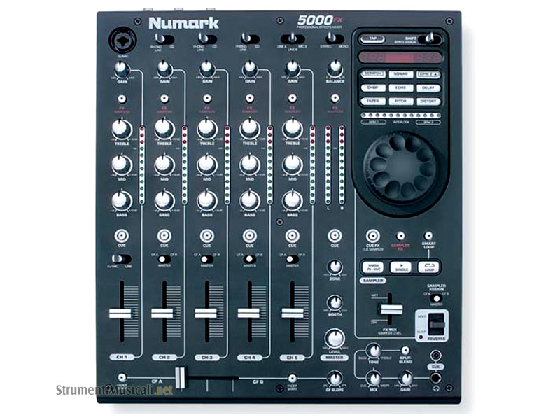 Numark 5000FX è un mixer 5 canali per DJ con campionamento, scratching, ed effetti integrati. 3 gli ingressi phono disponibili, 9 quelli line (3 commutabili phono) e 2 quelli microfonici, incluso un connettore combo collocato sulla plancia. Per quanto riguarda le uscite, il mixer 5000FX fornisce connessioni XLR bilanciate e RCA master, zone, booth, record, oltre a un uscita digitale formato S/PDIF. Tra le caratteristiche addizionali si segnalano 2 analizzatori di BPM, fader start, e crossfader rimpiazzabile con dissolvenza regolabile. Grazie alle funzioni avanzate di campionamento, loop e agli effetti integrati, FX5000 diventa il mixer di punta per quanto riguarda i mixer da tavolo del marchio Numark. Questi punti di forza lo rendono vincente in tutte le applicazioni professionali quali console per DJ, home e project recording studio dance, radio, locali da ballo e d'intrattenimento in genere (discoteche, pub, karaoke bar, installazioni, feste). Per ciascuna di queste categorie di installazione vi è, infatti, un beneficio diretto: per il recording studio l'uscita digitale, per i locali le numerose uscite analogiche, per i DJ il crossfader assegnabile e intercambiabile, per le radio il fader start. Per tutte le categorie effetti, campionamento e i 5 canali/ingressi rappresenteranno un valore aggiunto di qualità per aiutare i professionisti nel loro lavoro quotidiano e gli amatori nella loro passione. Il doppio conta-battute integrato sarà di fondamentale importanza nell'ambito educational.