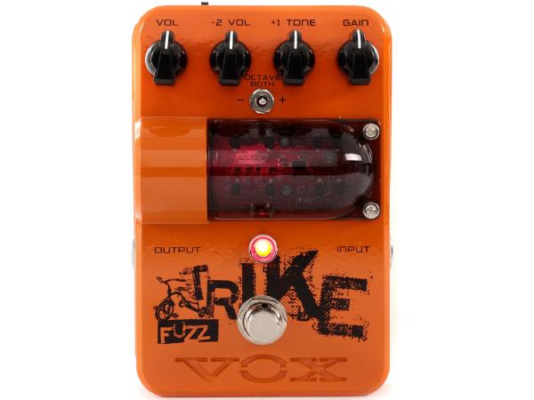 Il VOX Trike Fuzz trabocca di caratteristiche vintage utilizzando diodi appositamente selezionati. Copre non solo un'ottava in su, ma anche due ottave in basso. È possibile scegliere tre tipi di impostazioni di attave differenti: 1, -1 e -2, oppure tutte le ottave in alto e in basso per ottenere veri suoni fuzz vintage. Inoltre, c'è un controllo di tono per l'ottava +1 e un controllo di volume per l'ottava -2. Dato che il Trike Fuzz gestisce i circuiti delle ottave in basso in serie e li combina in parallelo con l'ottava in alto, è possibile creare una vasta gamma di suoni che non possono essere ottenuti con le unità di Octave Fuzz esistenti.