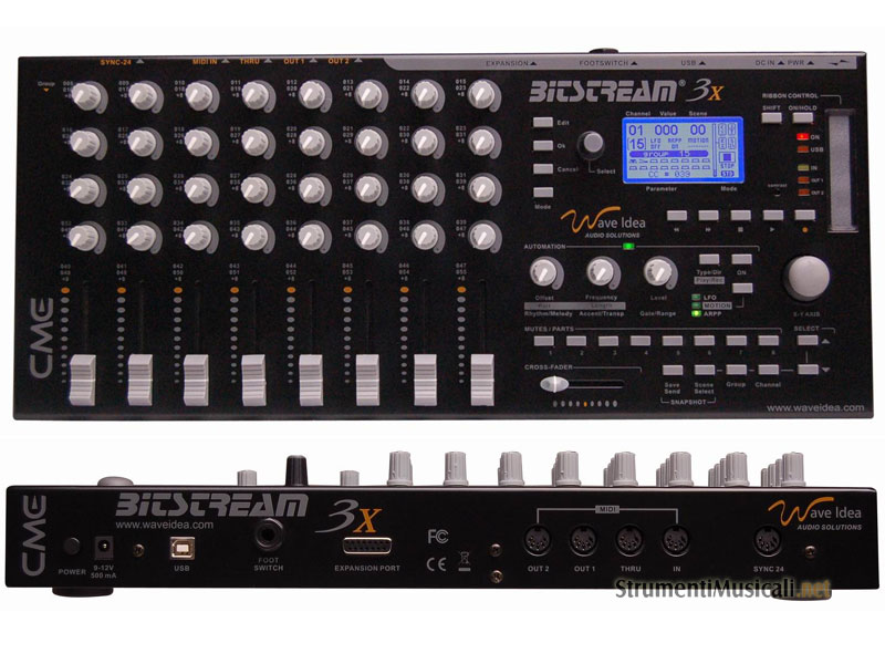 Il Bitstream 3X è un controller potentissimo che include 35 potenziometri rotativi, 8 slider, 16 pulsanti, joystick su i due assi x/y (con l'asse Z che può essere controllato dal ribbon!), ribbon controller, cross-fader, ecc. Tutti questi controlli sono completamente programmabili e ci permettono di integrare il Bitstream 3X in qualsiasi setup MIDI. Fino a 21 differenti eventi MIDI possono essere assegnati su un singolo potenziometro o qualsiasi altro controller! Una delle qualità che rendono il Bitstream 3X unico nel suo genere riguardano le funzioni di automazione sia in situazioni live che in studio. Queste funzioni permettono di gestire diversi processi con semplicità e rimanere focalizzati sulla propria musica. Inoltre si ha la possibilità di disporre di un LFO, sofisticati arpeggiatori per generare groove creativi ed 8 tracce per il motion sampler. 100 scene memorizzabili permettono di richiamare in tempo reale ogni configurazione precedentemente salvata! E' anche presente una funzione di trasporto, per il controllo di qualunque sequencer software o hardware. Il Bitstream 3X dispone di diversi input/output MIDI ed USB, cosichè ogni controllo che genera eventi MIDI può essere indirizzato a piacere. Inoltre il Bitstream 3X Ë equipaggiato con un SYNC 24 output per la sincronizzazione di sintetizzatori "vintage", un foot switch input, un MIDI Thru output ed una expansion port dedicata alla connessione di moduli esterni che saranno disponibili al più presto. Il controller è già programmato con tutti i control change (cc) disponibili, che possono essere assegnati a qualsiasi controllo del Bitstream 3X. Questa modalità è indicata per controllare software di ultima generazione come Reaktor,Traktor DJ, Absynth, Reason, Fruity Loops, Cubase, Live e molti altri software controllabili via MIDI. Sono disponibili oltre 13.000 presets! Oltre alla modalità standard, il Bitstream 3X ha una modalità dedicata a Reason, compatibile con la Propellerheads remote technology, disponibile a partire dalla versione 3 di Reason. Il Bitstream 3X determina automaticamente la configurazione di tutti i controlli dei dispositivi di Reason, assolutamente senza alcuna programmazione. Una volta che il Bitstream 3X cambia gruppo, anche il device controllato in Reason cambia automaticamente, così che l'utente si ritroverà tutti i potenziometri, slider, pulsanti, ribbon,... disponibili per ogni device di Reason.
