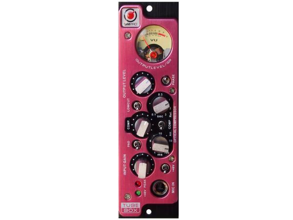 TubeBox è un preamplificatore microfonico valvolare ad un canale in formato slot serie-500, caratterizzato da una elevata qualità sonora ed un design professionale. Questo piccolo ma potente dispositivo, è dotato di un preamplificatore valvolare in classe A, alimentazione phantom 48V, inversione di fase, pad -20 dB selezionabile, e un compressore ottico integrato super veloce. Il pannello frontale include inoltre un utile ingresso microfonico aggiuntivo (jack da 1/4" TRS), caratteristica normalmente non presente nei preamplificatori basati sul formato serie 500. Il facile accesso alla valvola 12AX7 la rende sostituibile con altri modelli vintage o moderni, consentendo di personalizzare il suono e le performance di TubeBox a proprio piacimento. Il compressore ottico integrato dispone di controlli per la regolazione del rapporto di compressione, dell'attacco, del rilascio e la possibilità di utilizzare il VU meter intergrato per visualizzare il master level e il gain reduction. La qualità sonora del compressore integrato è garantita dall'amplificatore LME49720 che assicura una distorsione e una rumorosità estremamente basse.