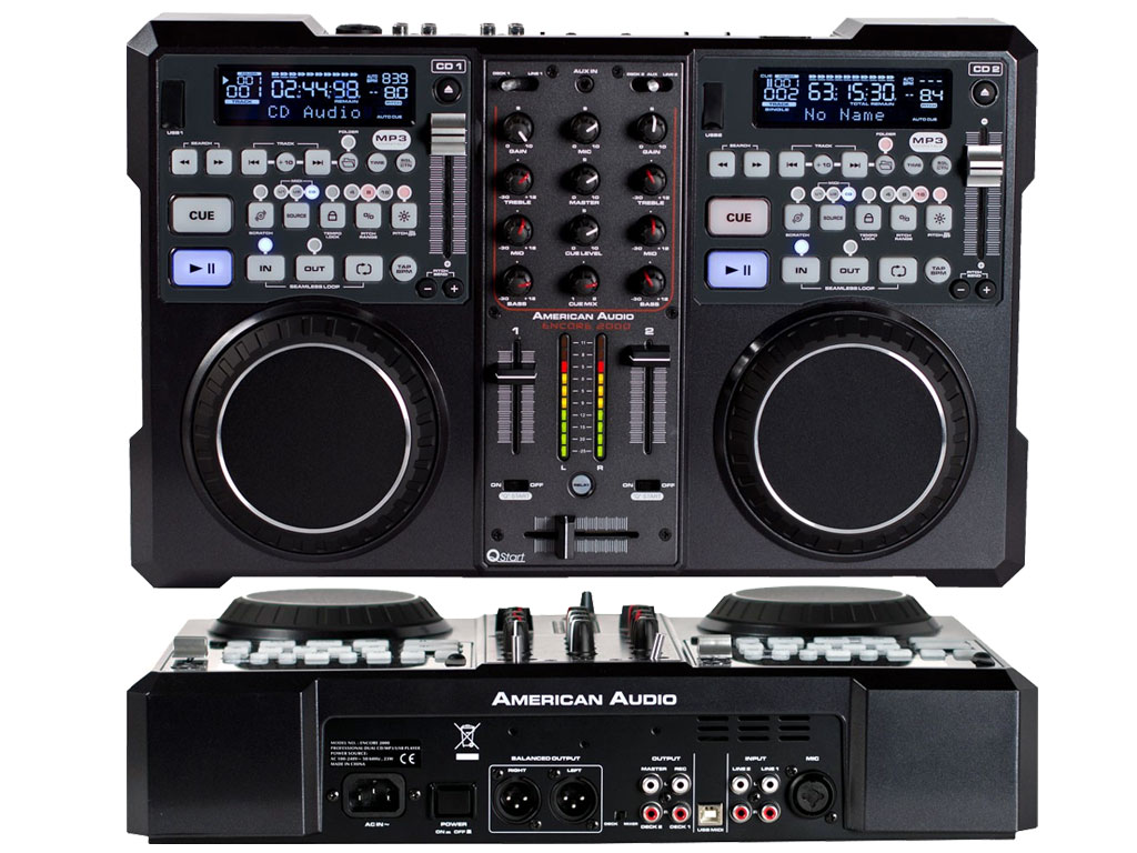American Audio Encore 2000 è un doppio lettore CD/MP3 con mixer a 2 canali e uscite XLR pronto per essere collegato ad un amplificatore o a diffusori amplificati. Viene fornito con il software Virtual DJ LE in dotazione. Questo combo "all in one" offre a tutti i DJ la possibilità di essere sempre organizzati, di suonare professionalmente e di essere sul pezzo nel dominio digitale. Ha tutto ciò che occorre per riprodurre e mixare Mp3, CD e CD-R a livello professionale. Oltre ad un ingresso MIDI, Encore 2000 è dotato di 2 ingressi di linea per ulteriori ingressi CD, 1 ingresso ausiliario (mini jack per lettore MP3, ecc.), 1 ingresso microfonico e 2 ingressi USB (per chiavette o HD esterni). Encore 2000 è dotato di un luminoso display LCD, scratch sensibile al tocco e della funzione Relay che permette di alternare automaticamente la riproduzione fra i due banchi ad ogni traccia o alla fine di ogni CD. L'apparecchio comprende un alloggiamento per lettori MP3 che si installa subito sopra all'ingresso mini jack ausiliario rendendo così ancora più semplice al DJ riprodurre brani dal suo lettore MP3 preferito.