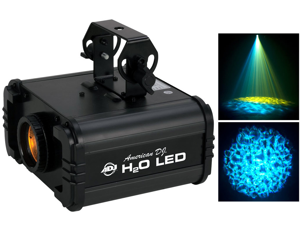 L' American DJ H2O LED è un multicolore effetto di simulazioni del movimento dell'acqua con una sorgente luminosa LED da 10W. L'unità non produce quasi nessun calore, richiede poca potenza (22W max) e può essere utilizzata per tutta la notte senza cicli di lavoro. Questo popolare effetto può funzionare in 2 diverse modalità: scorrimento dei colori senza soluzione di continuità o funzionamento a colore singolo. L'H2O LED può essere utilizzata con o senza l'uso di nebbia.