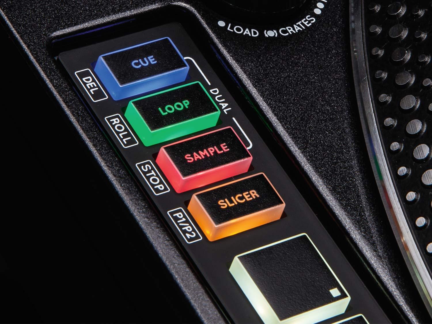 • Sezione MIDI: 1 manopola Trax di grandi dimensioni, 8 drum pad illuminati, 4 pulsanti per cue, loop, sample e user