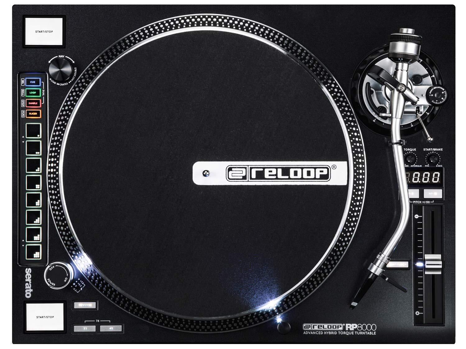 Reloop RP-8000 combina le funzionalità avanzate dei giradischi professionali, con le moderne tecnologie di mixaggio digitale utilizzate dai DJ. Il risultato è un turntable a trazione diretta con torque elevato, che integra una speciale sezione di controllo utilizzabile con qualsiasi software per DJ, compatibile con il protocollo MIDI. RP-8000 include inoltre mappature pronte all'uso per Serato Scratch Live. La superficie di controllo MIDI/USB di RP-8000, include una comoda manopola per la navigazione all'interno delle tracce e 8 drum pad illuminati dotati 4 modalità di funzionamento per il controllo delle funzioni principali del software di mixaggio, come loop, cue point, campioni. La speciale modalità "Dual" consente di suddividere in 2 banchi gli 8 pad, in modo da controllare contemporaneamente 4 cue point e 4 lunghezze di loop. In aggiunta, è disponibile un banco utente personalizzabile secondo le proprie esigenze. La rivoluzionaria modalità Link consente di collegare tra loro in cascata 4 giradischi RP-8000, e di controllare fino a 4 deck del software di mixaggio. I giradischi si assegneranno automaticamente in modo consecutivo ai deck presenti sul software.