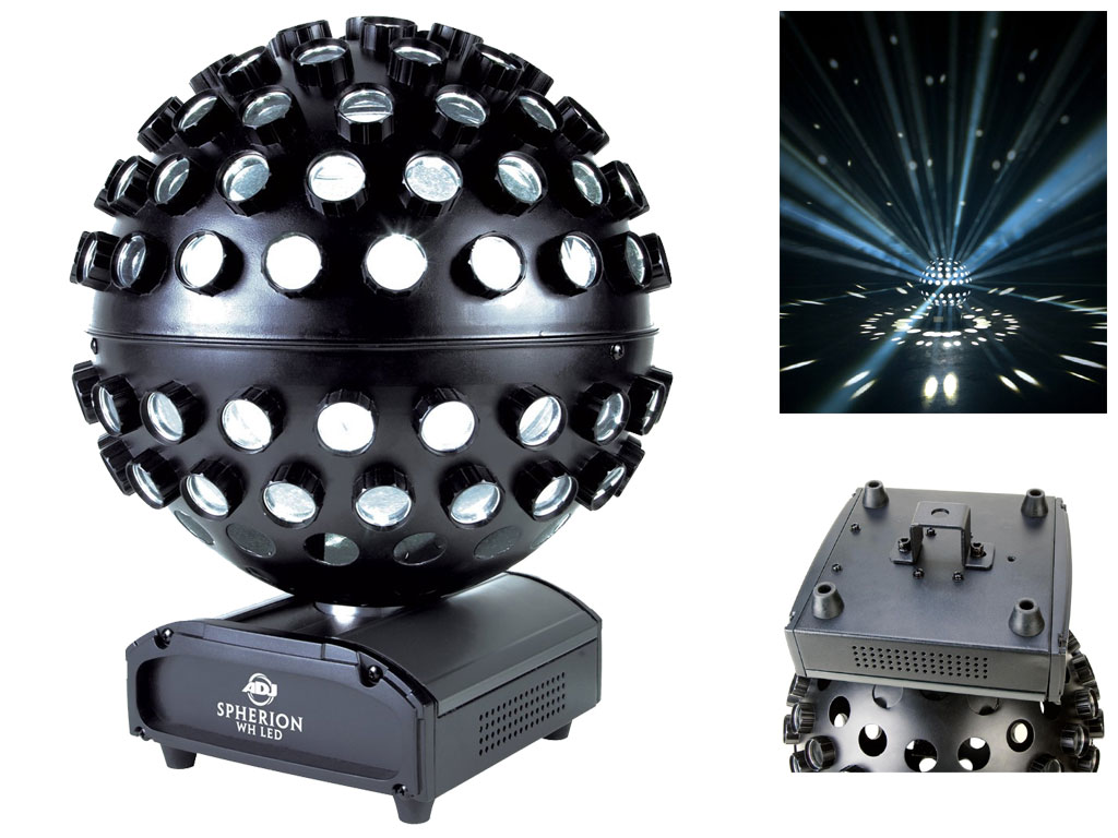 Spherion WH LED produce un effetto luce simile ad una moderna palla a specchi. Equipaggiato con cinque luminosi LED bianchi da 3 W, proietta nitidi raggi che ruotano e illuminano un intero ambiente. L'apparecchio assorbe solo 27 W ed è dotato di piedini in gomma e staffa removibile in modo da posizionarlo a terra o fissarlo a soffitto.