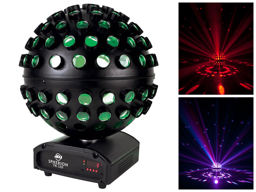 Spherion TRI LED produce un effetto luce simile ad una moderna palla a specchi. Equipaggiato con cinque luminosi LED tRI-COLOR da 3 W, proietta nitidi raggi attraverso 116 lenti colorate che ruotano e illumina un intero ambiente. L'apparecchio assorbe solo 27 W ed è dotato di piedini in gomma e staffa removibile in modo da posizionarlo a terra o fissarlo a soffitto. I suoi tre canali DMX permettono di controllare la velocità e direzione della rotazione, il dimmer, l'effetto strobo e il cambio colori. Spherion TRI LED è inoltre dotato di eccitanti programmi preimpostati ad attivazione musicale accessibili semplicemente accendendo l'apparecchio.