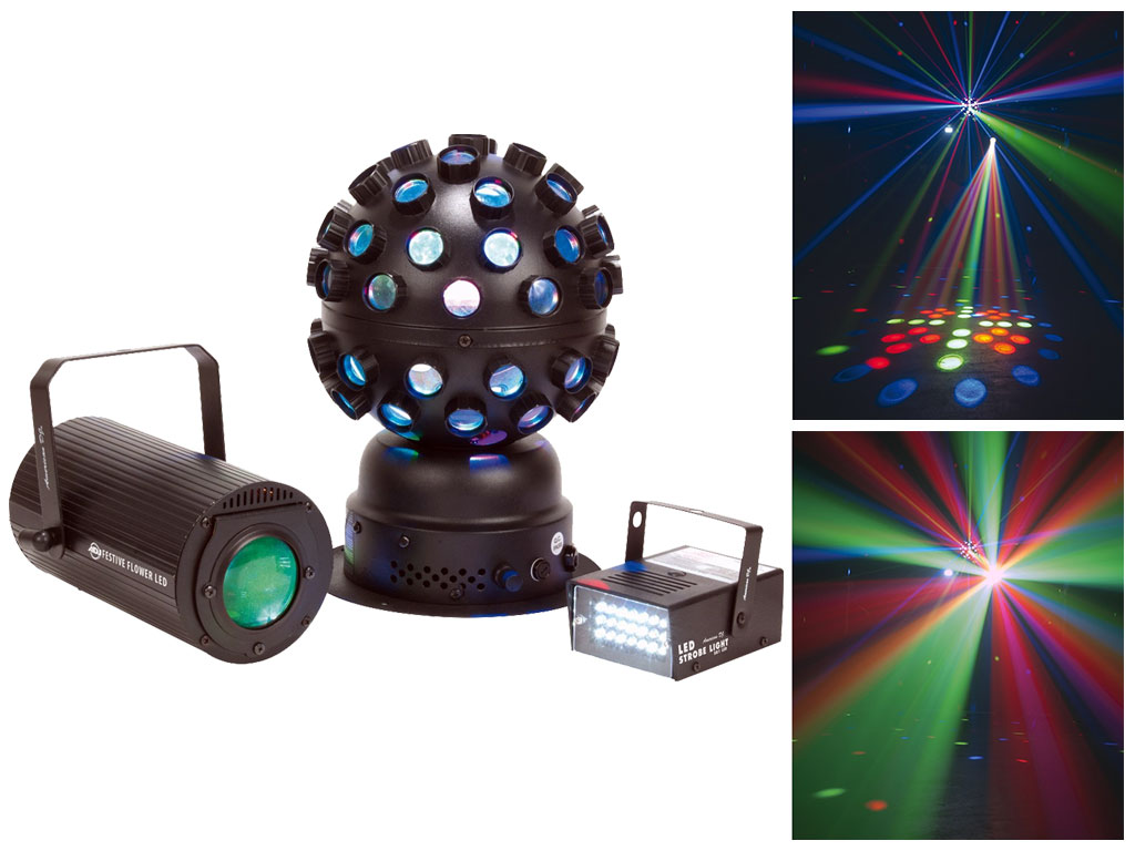 Questo speciale trio estremamente conveniente, è una soluzione di illuminazione ideale per feste casalighe o per i DJ itineranti che hanno bisogno di una scintilla di divertimento e di luci variopinte a tempo di musica.