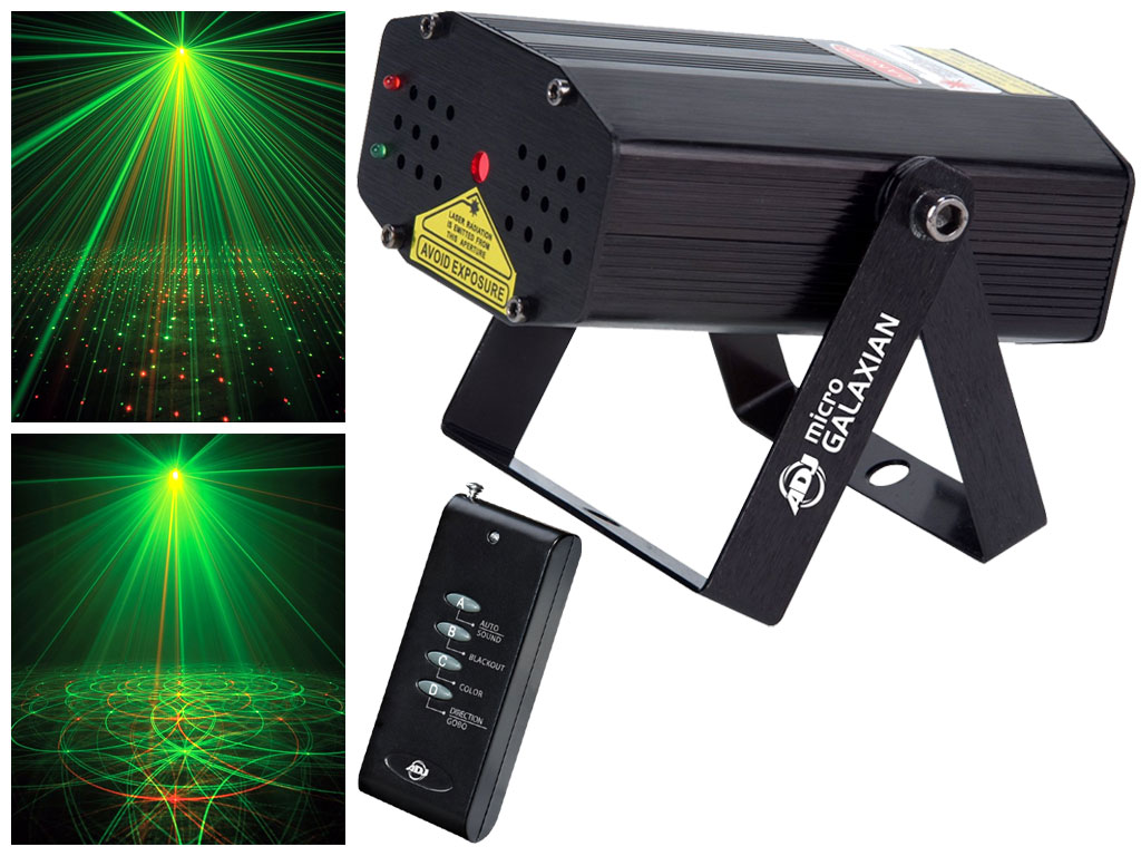 Questo laser verde e rosso emette più di 200 raggi che possono essere proiettati sul muro, sul soffitto o sulla pista da ballo. Sicuro da utilizzare, questo laser è conforme agli standard FDA. Il Micro Galaxian è facile da usare: è sufficiente accenderlo e attivare i programmi automatici o ad attivazione musicale incorporati. Il Micro Galaxian è dotato di doppia staffa e di telecomando , grazie alle dimensioni compatte e alla sua leggerezza, è ideale per feste, gruppi musicali, club, bar e DJ.