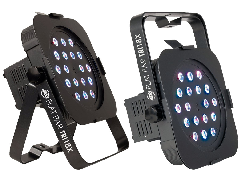 ADJ Flat Par TRI18X è un proiettore Par a LED con profilo ribassato e resa luminosa estremamente brillante. È caratterizzato da 18 TRI LED da 3 W (RGB 3-in-1) e non proiettano alcuna ombra RGB. Il profilo ribassato, la presa di alimentazione e gli ingressi/uscite DMX posizionati lateralmente, nonché la doppia staffa per il montaggio sospeso, rendono l'unità ideale per intrattenitori itineranti, installazioni fisse e montaggio su traliccio per illuminazione ascendente. Flat Par TRI18X ha sette modalità canale DMX e può funzionare anche in modalità Sound-active o Master/Slave. È anche possibile utilizzare il telecomando wireless ADJ LED RC (venduto separatamente). Questo proiettore Par è inoltre caratterizzato da: 32 macro colore, dimming elettronico (0-100%), ingressi e uscite CA IEC sul retro dell'unità per collegamento in cascata (daisy chain) ed un angolo di proiezione del fascio luminoso di 40 gradi. I LED del Flat Par TRI18X hanno un durata nominale di 50.000 ore ed un assorbimento di soli 60 W per unità.