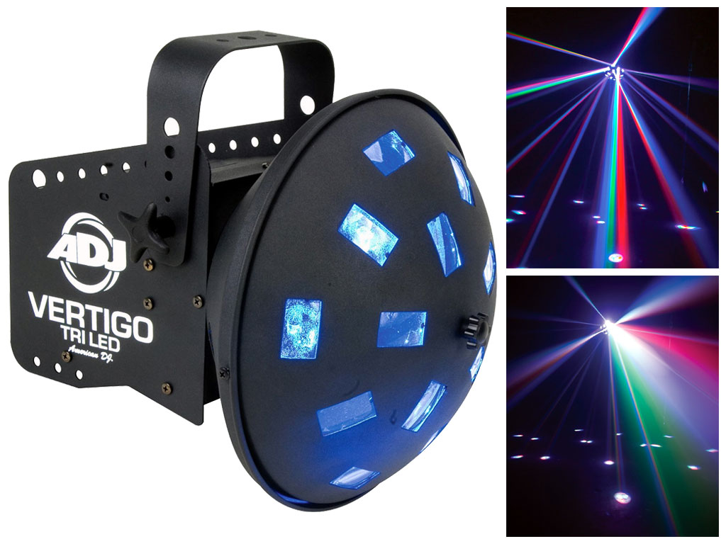 Il Vertigo Tri LED di American DJ aggiunge brillantezza e vita ad ogni ambiente con 32 raggi ​​ e strobo che si muovono al suono della musica, per un effetto tipo moonflower. Utilizza 2 Tri Colore LED da 9W 3-in-1 RGB (100.000 ore) per produrre una varietà di effetti colore tra cui rosso, verde, blu, viola, giallo, ciano e nero. Il Tri LED Vertigo ha connessioni di alimentazione In/Out IEC per collegamenti daisy-chaining e include una staffa per il montaggio sospeso. Grazie alla tecnologia LED, l'effetto luce utilizza solo 30W di potenza.