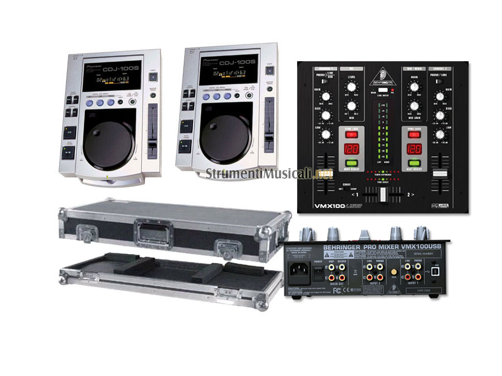 Il kit è composto da 2 lettori CD Pioneer CDJ100S, 1 Flight case professionale PROEL, 1 mixer Behringer VMX100 USB e dai relativi cavi per il collegamentotra mixer e lettori CD.