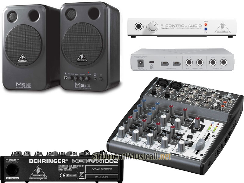 Bundle Home recording composto da: 1 x mixer Xenyx 1002, 1 x scheda audio FCA202 Firewire, 1 x coppia di monitor MS16, cavi per i collegamenti (2 x jack-jack 6.3mm 3mt, 1 x 2 RCA-2 Jack 6.3mm, 1 x cavo firewire)