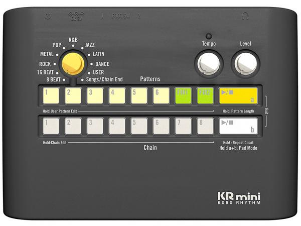 Per tutti coloro che sono alla ricerca di uno strumento immediato, perfetto per l'accompagnamento ritmico durante gli esercizi, nell'allenamento, il Korg KRmini rappresenta la soluzione ideale. Grazie al suo design minimale permette di selezionare i pattern ritmici mediante un potenziometro e riprodurlo premendo Play. Il KR mini è un riproduttore di basi ritmiche per i musicisti alla ricerca di un appoggio ritmico per le loro sessioni di allenamento, che vada oltre il classico metronomo, senza dover impazzire in complessi menù di editing e funzioni. I 60 pattern ritmici sono suddivisi in banchi da 6 preset ciascuno, e coprono generi quali 8-beat, 16-beat, rock, metal, pop, R'n'B, Jazz, latin e dance. La funzione Chain consente di concatenare differenti pattern ritmici, tra i quali potrai interporre del fill (2 sono quelli disponibili per ogni genere). Questi ultimi saranno riproducibili mediante un pedale (non incluso) collegabile ad uno dei due ingressi footswitch del Korg KR mini; l'altro consentirà la riproduzione e l'interruzione dei pattern. I 16 pulsanti dello strumento fungono da pad sensibili alla dinamica, e consentono di suonare tramite l'uso delle dita i vari sample di batteria integrati (cassa, rullante, hi-hat e cymbals), quindi registrare le tue performance ritmiche. Lo speaker integrato da 2W ti permetterà l'utilizzo anche in assenza di un impianto di diffusione audio, al quale potrai collegarti tramite l'uscita jack cuffia/speaker. Korg KR mini si alimenta con 3 pile AA (autonomia di circa 7 ore), oppure tramite l'alimentatore (DC 9V) acquistabile separatamente.