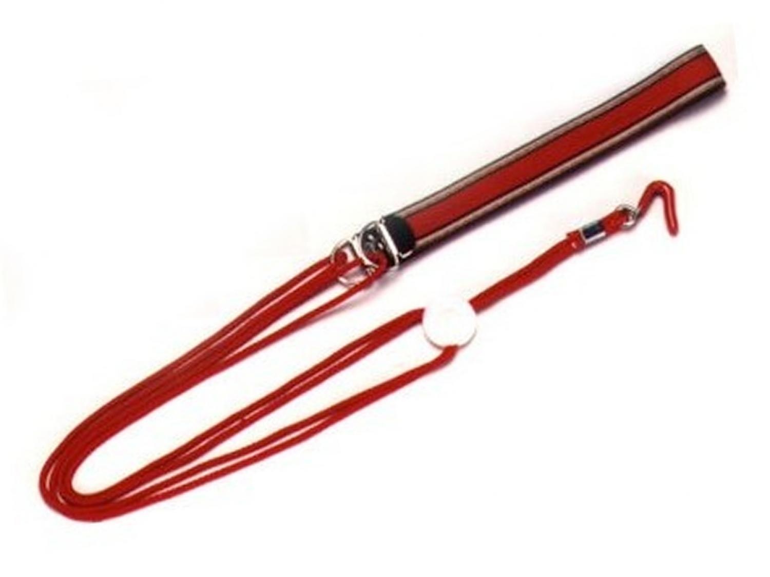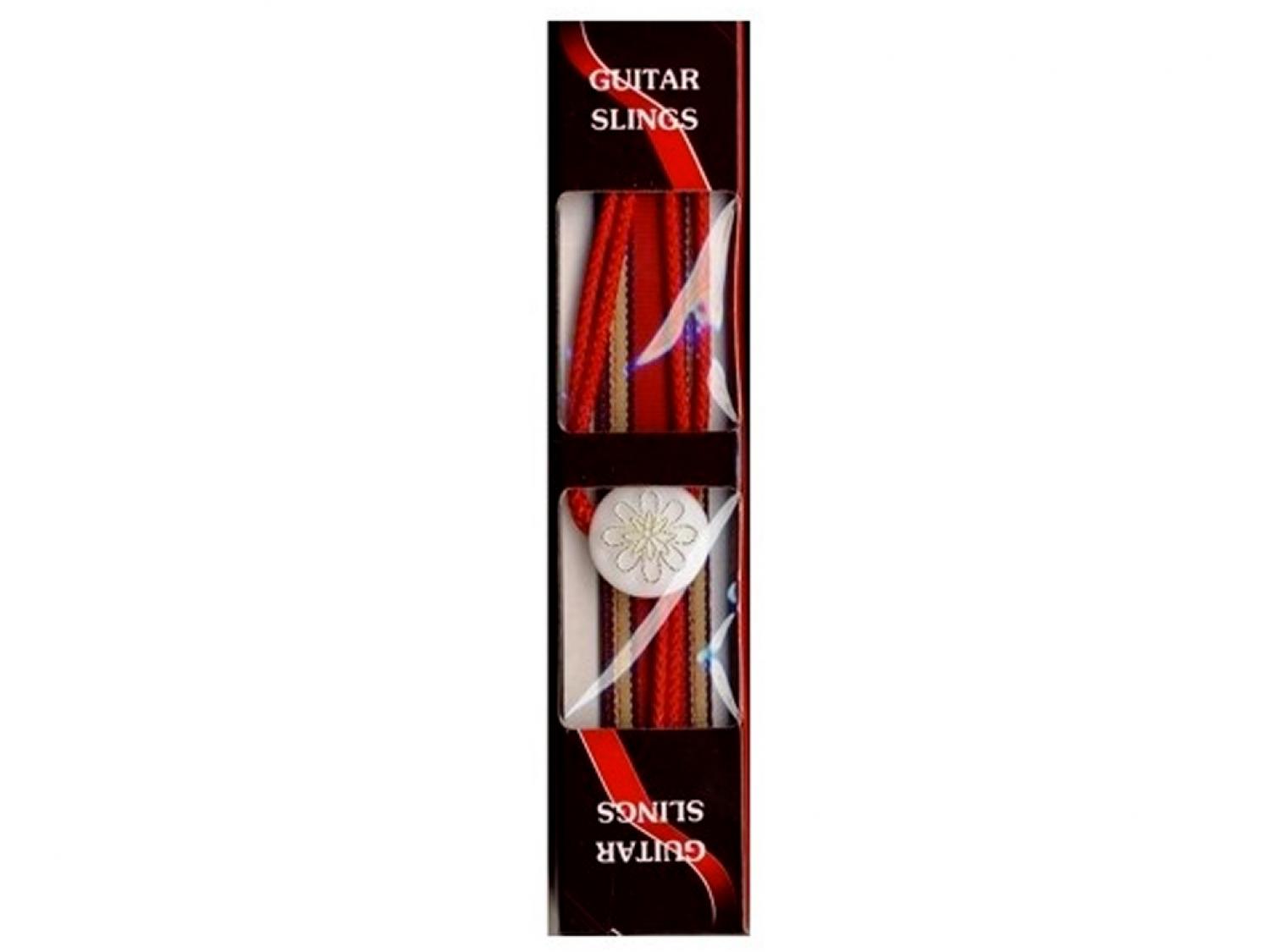 Elegante collare per chitarra classica in tessuto lavorato, con cordoncino regolabile in nylon rosso e gancio.