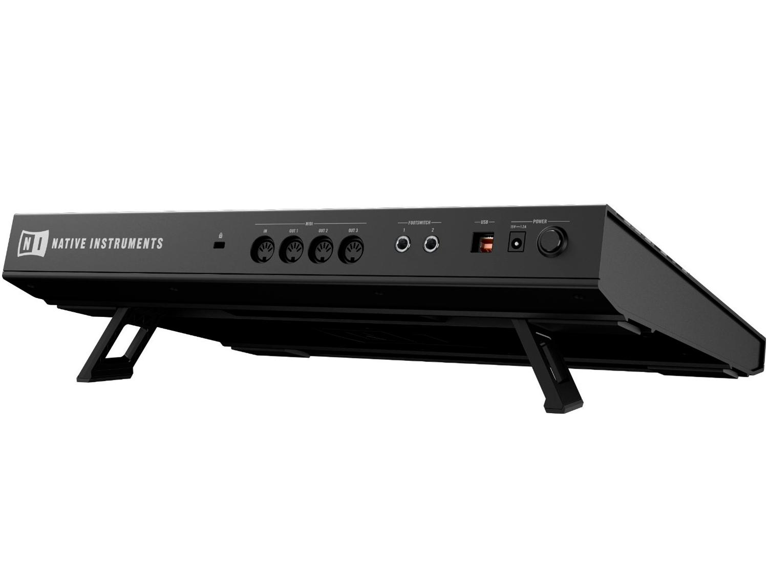 Notevolmente più grande rispetto all'hardware originale, Maschine Studio offre un ampliato controllo tattile e nuovi display a colori ad alta risoluzione, stabilendo un nuovo precedente nella produzione groove computer-based. Maschine Studio è una soluzione integrata che combina la più recente tecnologia software con un flusso di lavoro basato su hardware. Fornendo un controllo hardware completo su tutte le funzioni software, il flusso di lavoro di Maschine Studio è incentrato su 16 pad retroilluminati multicolor altamente reattivi, una nuova sezione Edit con Jog Wheel, una sezione Level e 2 display a colori ad alta risoluzione. I display permettono ai produttori di concentrarsi sul flusso di lavoro hardware, fornendo un dettagliato feedback visivo delle potenti funzionalità software. Quando si editano campioni o si lavora sul clip-based pattern sequencer, i display mostrano una panoramica completa della selezione sullo schermo di sinistra, mentre lo schermo di destra consente una dettagliata messa a punto durante slicing, editing e composing. I display forniscono una facile navigazione e selezione di progetti, gruppi, suoni, strumenti, effetti e campioni con le icone di strumenti ed effetti visibili direttamente dall'hardware. Una nuova sezione Edit fornisce tasti dedicati ed una jog wheel con indicatori LED per il feedback visivo e le funzionalità avanzate. La jog wheel consente un rapido adeguamento di volume, tempo, delle impostazioni swing, e velocizza navigazione ed editing. La Sezione Level fornisce una comoda manopola del volume e un display meter polivalente per i livelli master, group, sound, e cue oltre al monitoraggio di 4 sorgenti di ingresso per le interfaccia audio multicanale. Tasti di controllo dedicati consentono un rapido passaggio tra sampler, arranger, mixer e browser, e forniscono accesso diretto alle impostazioni dei canali ed un nuovissimo plug-in Strip. Inoltre un ingresso e 3 uscite MIDI consentono a Maschine Studio di funzionare come hub di comando, controllando tutte le attrezzature tramite un controller completo. Sulla parte inferiore dell'unità, un supporto pieghevole fornisce l'angolo ottimale per lavorare con Maschine Studio.