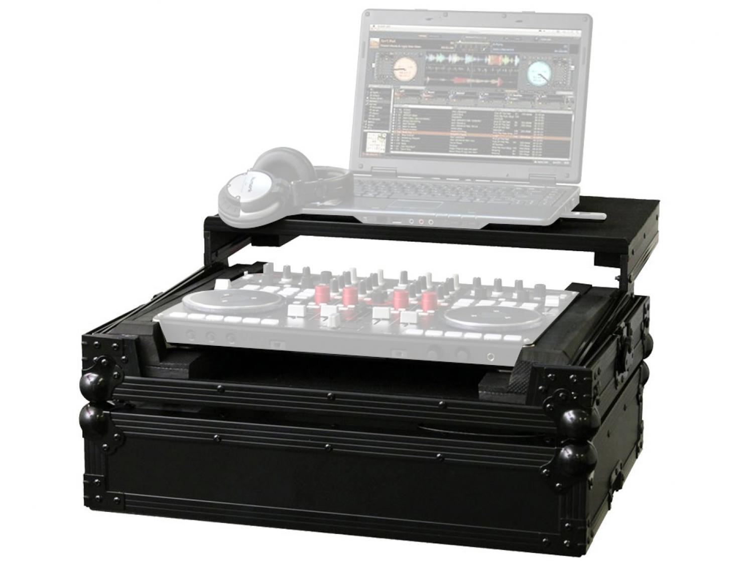 Flight case in grado di contenere un set composto da un controller tipo VESTAX VCI 400 DJ e da un laptop fino a 17". Questo modello impiega un supporto rialzato a slitta per posizionare laptop ed altri device. Grazie al particolare disegno dello chassis permette di trasportare il materiale già installato senza rischi. L'elegante pannello rimovibile V-Cut permette un facile accesso ai comandi frontali ed a cuffie / microfono. Un ampio pozzo di ventilazione sotto il controller è l'ideale per conservare cavi e altri accessori.