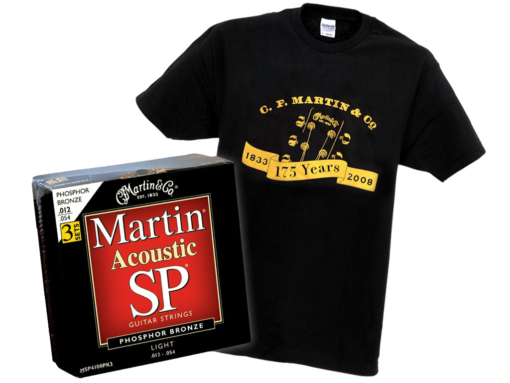 Questa confezione Martin comprende 3 set di corde per chitarra acustica MSP4100 Phosphor Bronze Light ed una T-shirt dal grande impatto visivo, comoda, che celebra il 175 ° anniversario di Martin. Le corde per chitarra acustica Martin MSP4100 Phosphor Bronze Light sono costituite da una lega con composizione 92/8 per dare quella brillantezza, chiarezza, e longevità del suono richiesto dai chitarristi. L'avvolgimento in lega di bronzo e fosforo è ideale per fare corde che hanno bassi profondi e ricchi, e gli alti profondi e brillanti che i chitarristi acustici di oggi richiedono.