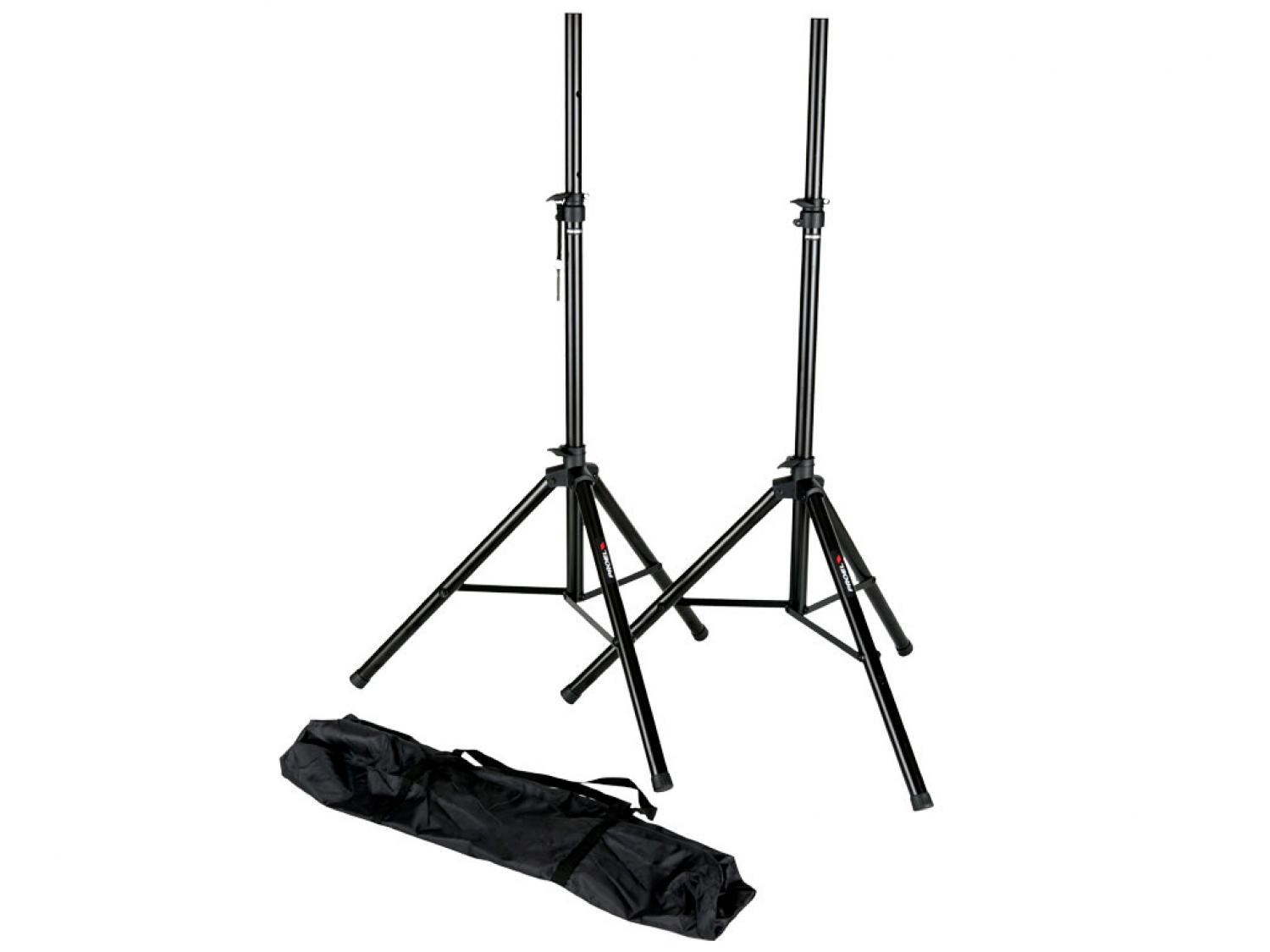Coppia di supporti per cassa acustica e sistemi luce in acciaio con snodi in nylon rinforzato. Sistema di sicurezza con pin in acciaio. Il set è fornito con una pratica borsa per il trasporto realizzata in nylon con divisorio interno.