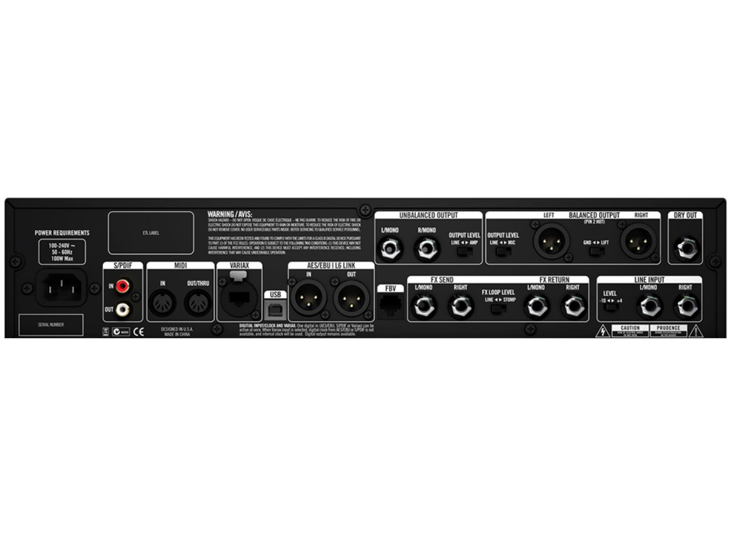 • Uscite 1/4" e XLR ( mono / stereo), MIDI I/O, S/PDIF I/O, USB, AES / EBU I/O, L6 LINK, FX loop (mono/stereo), 1/4" Aux-in, XLR mic-in con livello microfonico, 1/4" uscita cuffie, connessione Variax VDI, connessione footcontroller FBV