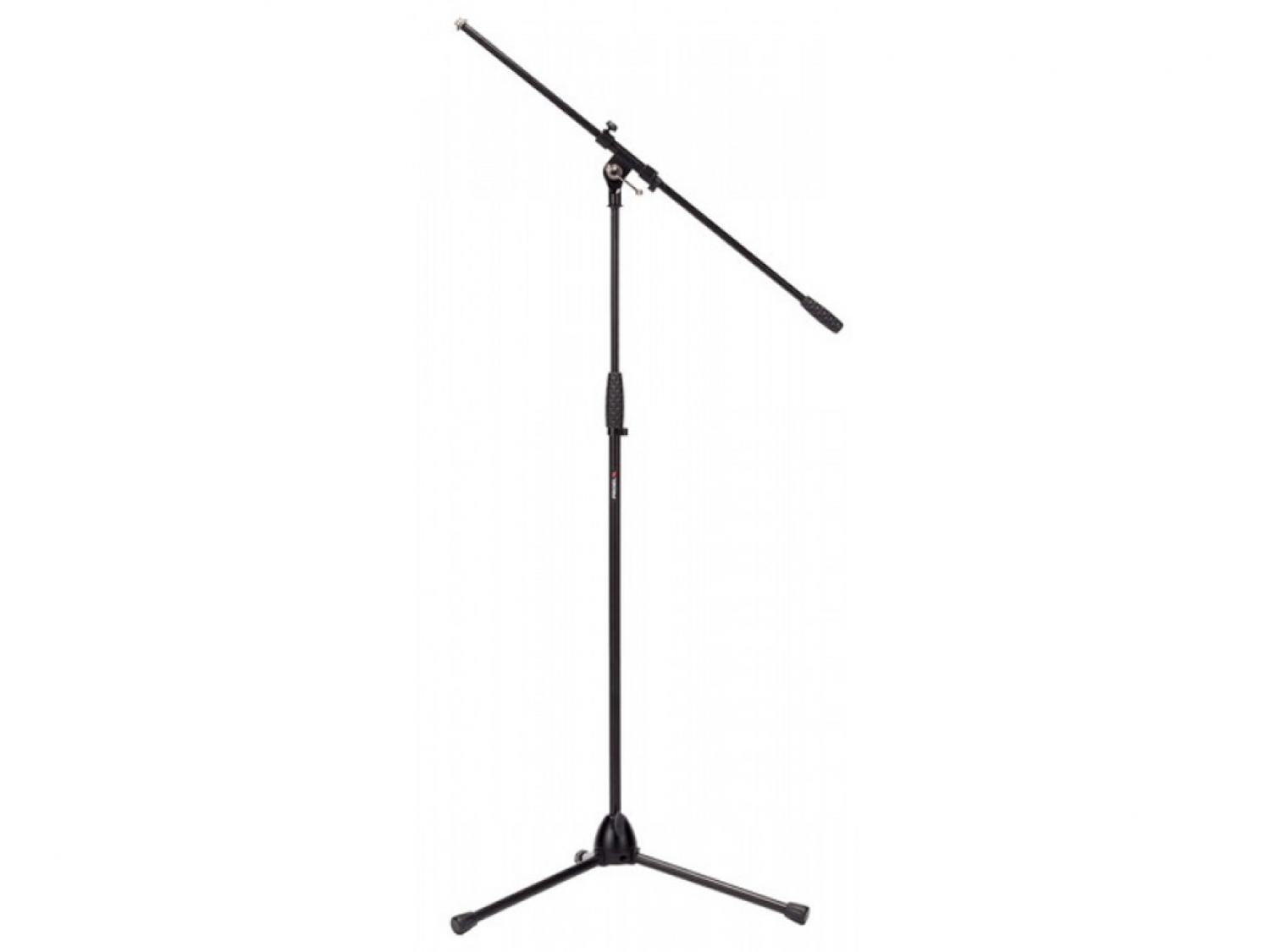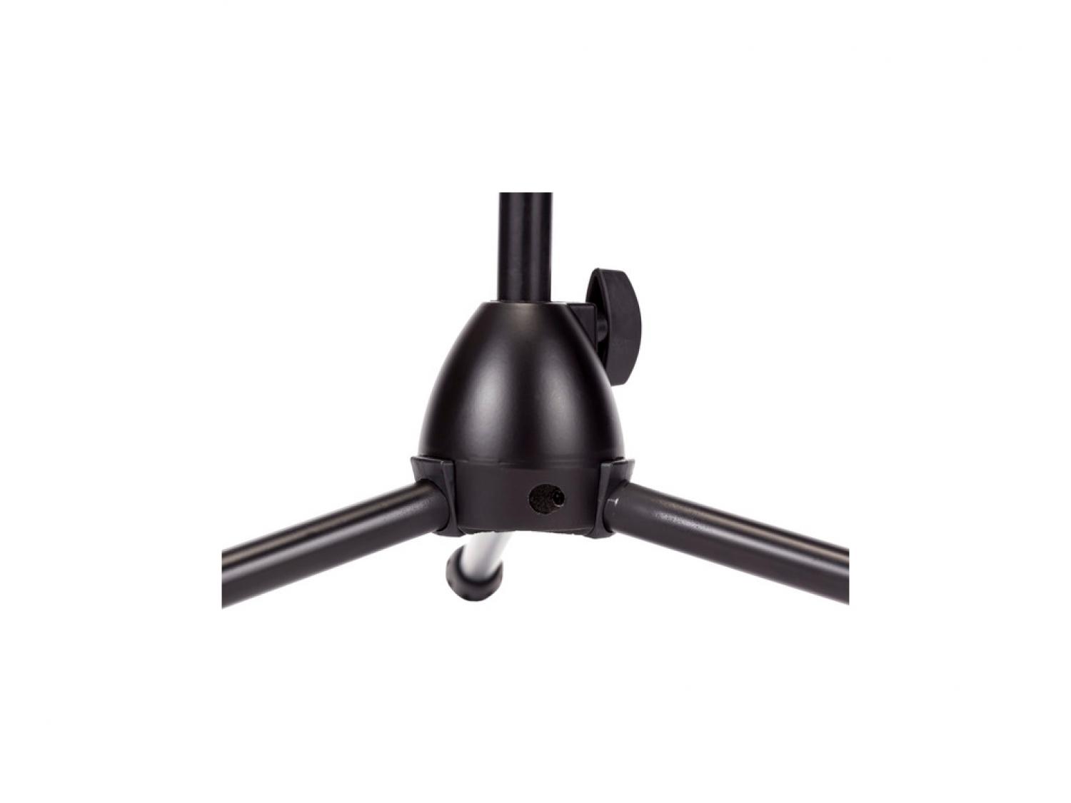 Asta professionale a giraffa per microfono. Dotata di tripode in alluminio pressofuso con inserti in nylon per i gambi. Snodo superiore di regolazione in acciaio con parti di scorrimento in nylon. Manicotto di regolazione dell'altezza e contrappeso, realizzati in gomma "soft grip". Disponibile nella finitura nero opaco.