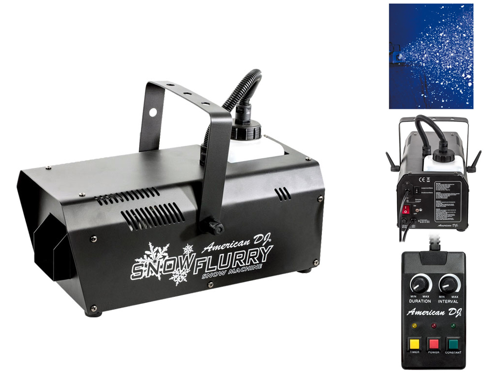 Snow Flurry produce realistici "fiocchi di neve" che vengono sparati verso l'alto con una gittata fino a 6m. La macchina include un telecomando con cavo, non removibile, mentre il serbatoio contiene un litro di speciale liquido concentrato e inodore per la neve.