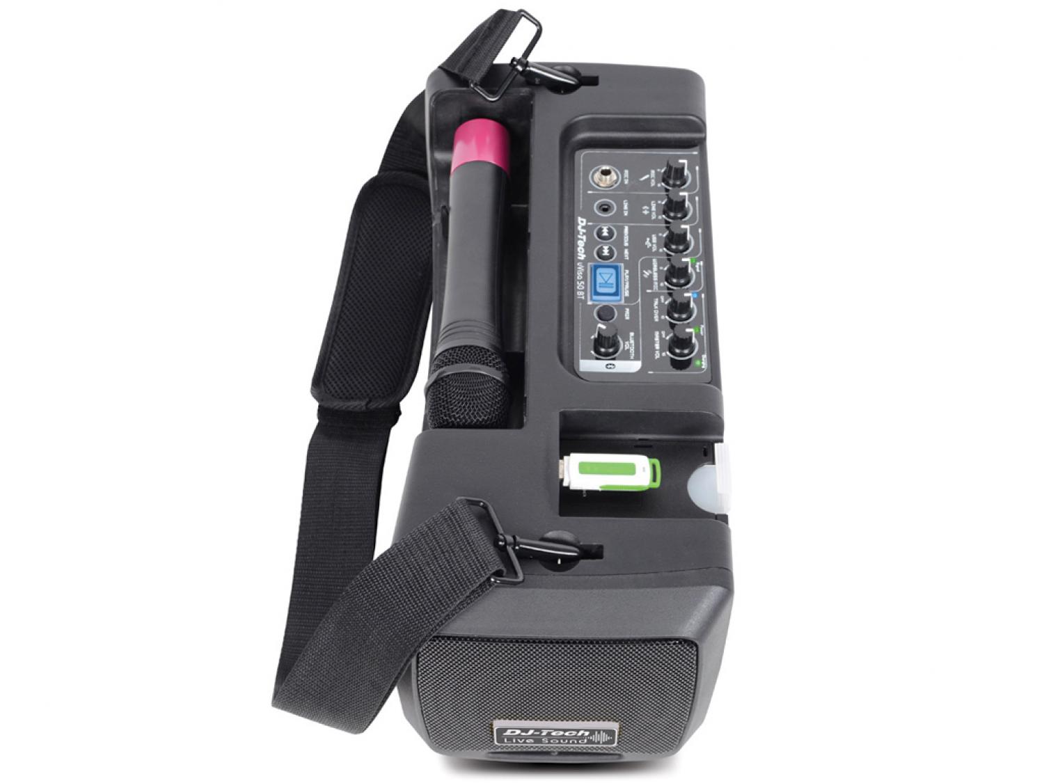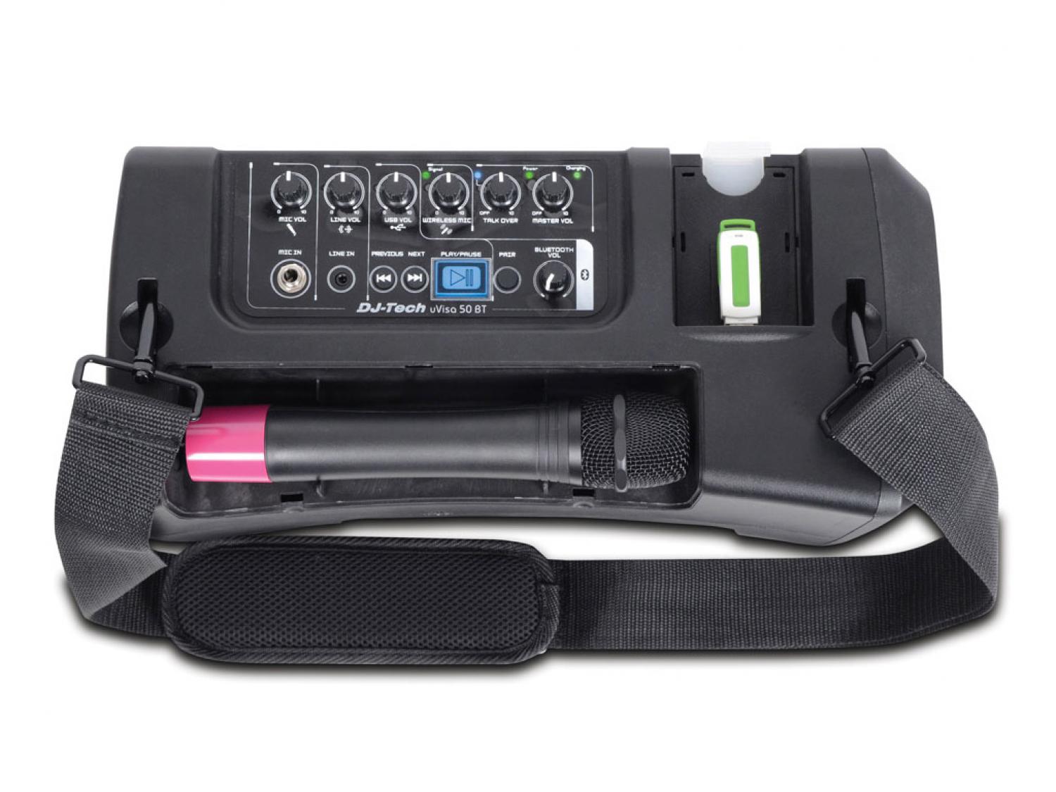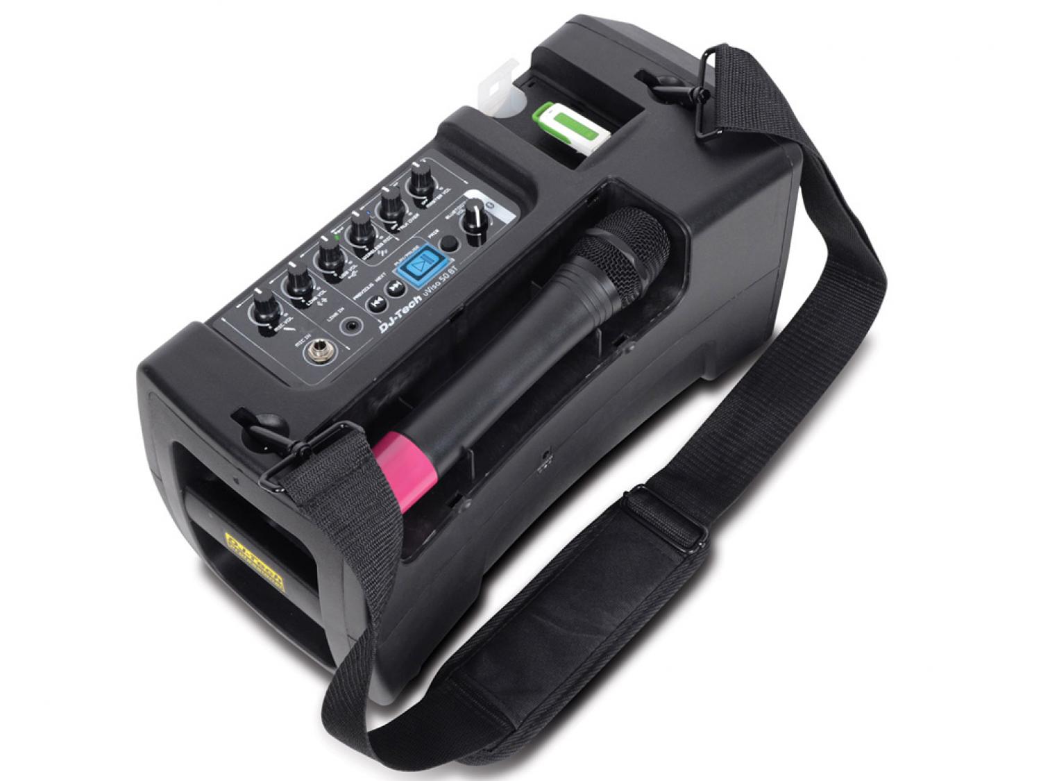 DJ Tech uVisa 50 BT è un sistema di amplificazione ultraportatile grazie alle dimensioni compatte, al peso ridotto e all'alimentazione a batterie. E' inoltre ricco di funzionalità: puoi utilizzare il microfono wireless integrato contemporaneamente al lettore MP3 USB o utilizzare le playlist nel tuo device via Bluetooth. Un ingresso aggiuntivo MIC/LINE vi permette di aggiungere un dispositivo esterno, come un lettore CD o DVD, o collegare una chitarra oppure un altro microfono. La funzione talkover darà automaticamente priorità al microfono. L'uVISA 50 BT è perfetto per l'utilizzo nelle scuole, nelle presentazioni, conferenze, palestre, manifestazioni e ovunque sia necessario un PA System portatile. Super leggero e semplicissimo da usare.