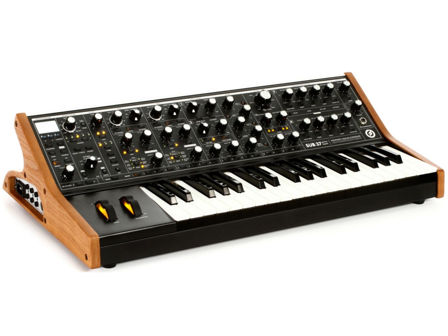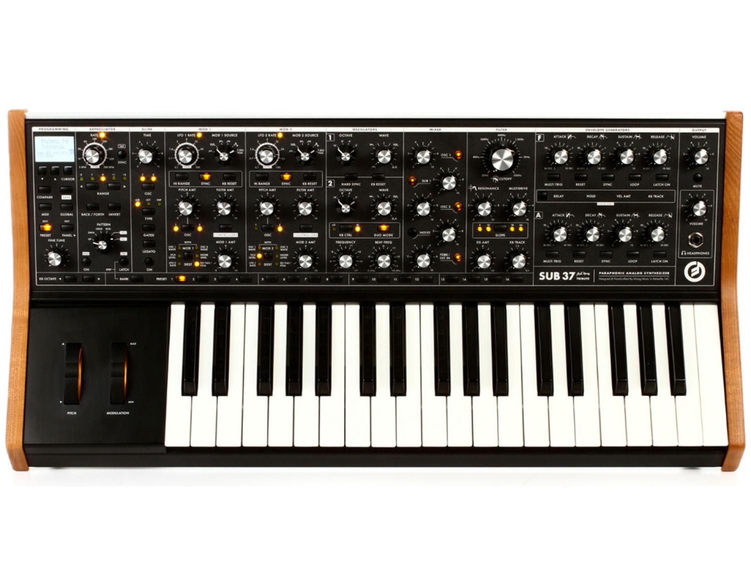 L'ultimo nato nella gloriosa famiglia dei sintetizzatori analogici è il SUB 37 Tribute Edition. Si tratta di un synth parafonico (2-note) in edizione limitata realizzato sulla base del motore di sintesi del pluri premiato Sub Phatty, ma pensato appositamente per incontrare le esigenze di tastieristi e sound designer che in questi anni hanno potuto fornire un valido feedback alla storica casa statunitense. Di fatto è il primo sintetizzatore Moog realizzato negli ultimi 30 anni in grado di suonare più di una nota per volta. Il pannello del SUB 37 ha una ricchissima dotazione di 40 manopole, 74 switch ed un display LCD dedicato. Il Sub 37 presenta sul suo ricco pannello frontale una sezione dedicata all'arpeggiatore, due sezioni di modulazione, due oscillatori, un sub oscillatore, un filtro e due inviluppi ADSR. La caratteristica prinicpale di questo Paraphonic Analog Synthesizer è proprio nell'utilizzo della parafonia, che consente di controllare note multiple con gli oscillatori che passano attraverso un percorso di filtri condiviso.