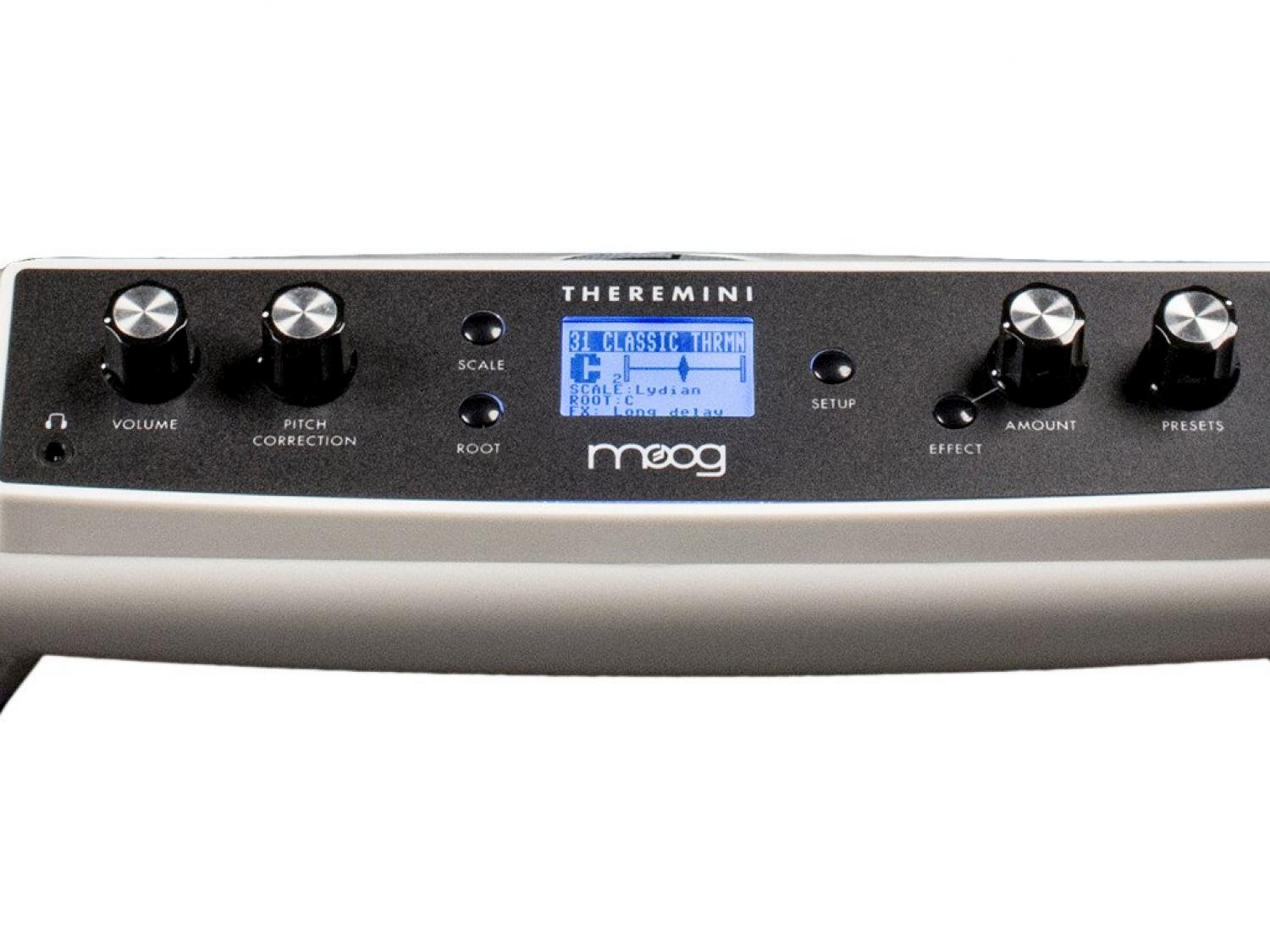 Il Theremini è la nuova versione sviluppata da Moog Music del Theremin, uno dei primi strumenti musicali elettronici della storia. Questa reinterpretazione prevede l'implementazione di nuove funzionalità avanzate che rendono accessibile a tutti questo strumento, finora non certo tra i più semplici da suonare. Il Theremini consente infatti di suonare ogni nota in una singola scala musicale discreta, e non in uno spazio continuo come con il modello originale grazie ad un controllo totale sull'intonazione che può essere regolato e disattivato. Il fatto di poter controllare il pitch diventa molto utile anche a fini didattici ed educativi per chi si avvicina per la prima volta a questo strumento. La sezione preset integrata consente di selezionare tra 32 suoni in sintesi wavetable, memorizzare e salvare una scala selezionata, impostare o richiamare un range selezionato di note per l'esecuzione e specificare le impostazioni per le patch per il delay stereo incluso. Sul retro dello strumento, che presenta un particolare design avveniristico, è presente anche un altoparlante che rende perfettamente autonomo il Theremini. Sono poi presenti due uscite audio di linea, un'uscita CV pitch con range selezionabile e una porta mini USB per la connettività MIDI.