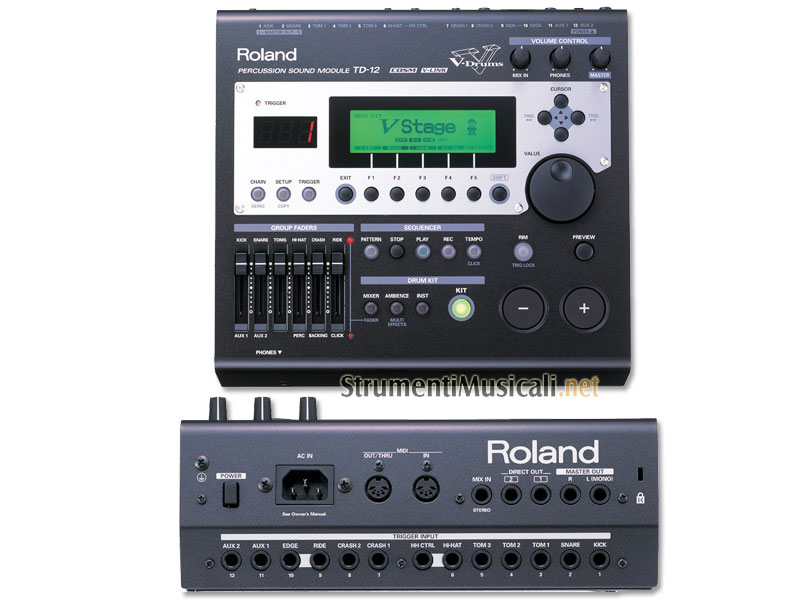 Il modulo V-Drum TD-12 deriva direttamente dal TD-20 e può quindi godere di ottima qualità sonora e versatilità di utilizzo. Roland ha infatti voluto compiere un grande sforzo per cercare di realizzare un modulo sonoro dal prezzo competitivo i cui suoni sono però la attuale massima espressione della modellazione COSM. Dai tamburi ai piatti questo modulo offre la qualità di uno strumento top level. L'ampio display LCD consente una navigazione ideale nei parametri di programmazione ed i dodici ingressi trigger consentono di poter realizzare un setup in grado di soddisfare le esigenze del musicista più esperto. I kit sono stati realizzati da batteristi professionisti e session man ma le possibilità di virtual editing consentono con semplici operazioni di creare il proprio kit in base al genere musicale preferito. Il modulo TD-12 supporta il positional sensing su rullante e sul ride così come sui tom quando viene suonato il rim. E possibile anche l'uso delle spazzole.