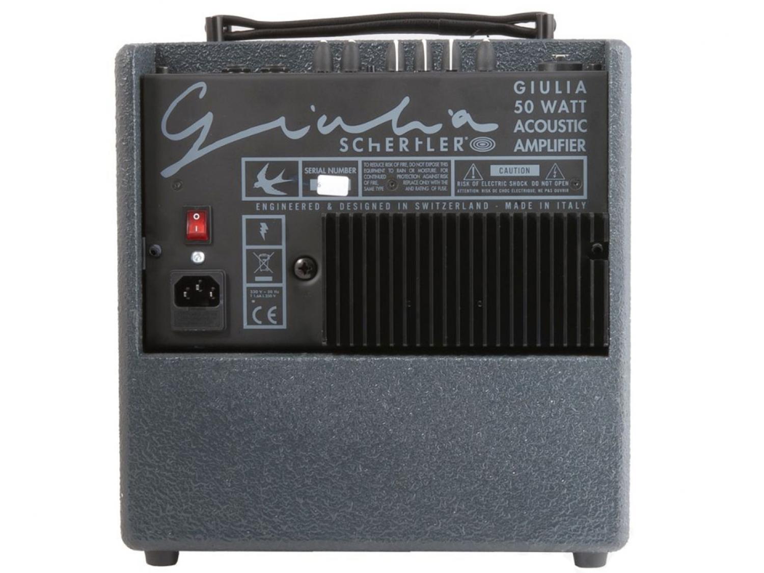 L'ultra compatto GIULIA è il più recente arricchimento della linea Schertler di amplificatori acustici. Ideale per piccoli ambienti, home studio e per esercitarsi, questo amplificatore fornisce la stessa alta qualità sonora, estetica e robustezza dei modelli più grandi JAM 100 e JAM 150, in un peso di soli 6,3 Kg. Equipaggiato con un tweeter a cupola da 1" ed un woofer da 5", GIULIA offre 50W bi-amp di potenza. Il suo canale input può alloggiare sia un connettore XLR che un jack 1/4" rendendolo particolarmente adatto per una vasta gamma di microfoni, inclusi i modelli DYN e STAT della Schertler o i pickup BASIK. E' disponibile anche l'alimentazione Phantom (48V e 10V). L'ingresso può essere utilizzato anche per una chitarra o altri sorgenti di linea mentre l'ottima elettronica dell'amplificatore è disegnata per adattarsi automaticamente alla fonte sonora. Il canale dispone inoltre di EQ-3 Bande e di filtro passa-bassi che rende il suono caldo con i pickup montati al ponte. Le uscite LINE OUT e DI OUT permettono la connessione ad un mixer, un subwoofer o altri dispositivi esterni. GIULIA dispone inoltre di reverbero digitale di alta qualità (controllato tramite potenziometro) e di una presa INSERT per collegare un processore dinamico esterno oppure un pedale volume.