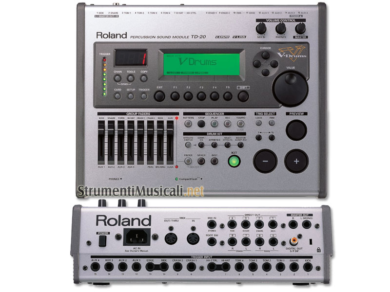 Il TD-20 è il miglior modulo sonoro per batterie elettroniche V-Drums mai realizzato prima. Oltre 500 nuovi suoni di qualità e dinamica superbe. La sezione V-Editing permette regolazioni di sensibilità che consentono al batterista di adattare con grande efficacia il suono alla propria tecnica. E' ora possibile scegliere fra differenti tipi di battenti così come decidere quali saranno i dettagli che determinano il suono dei nostri piatti inclusi il posizionamento virtuale dei microfoni. La possibilità di ottenere dettagli sonori prima impensabili come il rim sui tom o ancora la risonanza della cordiera del rullante che si genera suonando i tom o la cassa possono solo dare l'idea del realismo che si può ottenere sfruttando al meglio le caratteristiche di questo straordinario prodotto.