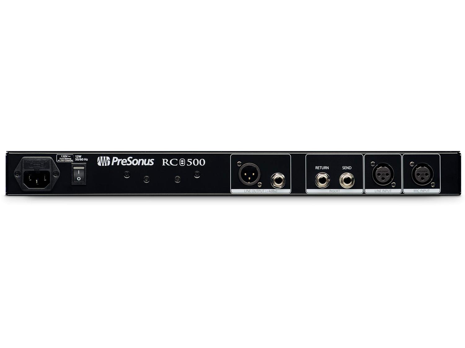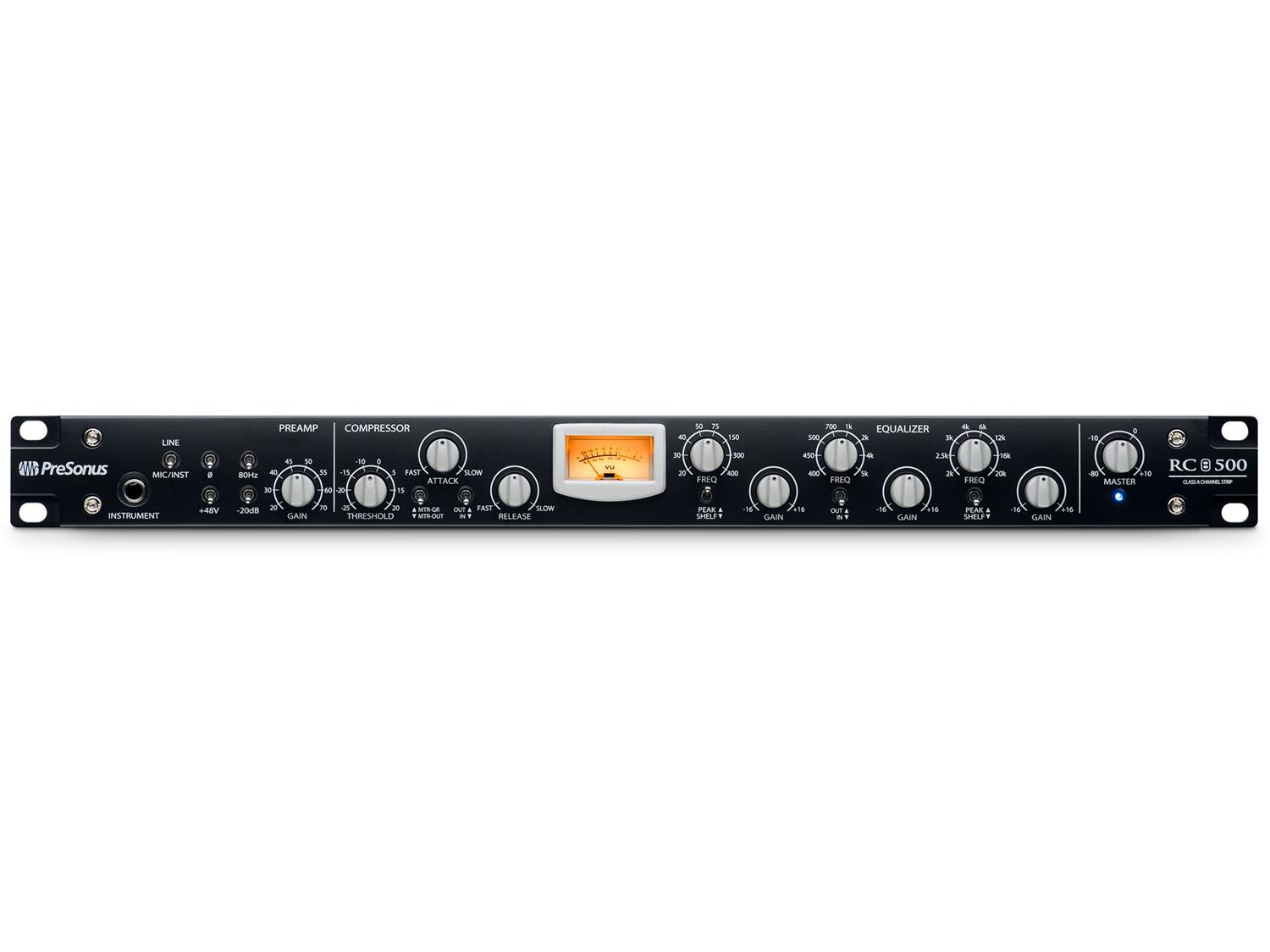Il PreSonus RC 500 offre un preamplificatore a stato solido in Classe A caratterizzato da bassissima distorsione e gain elevato, con la stessa circuiteria usata per il compressore FET e l'EQ semi-parametrico della blasonata channel strip valvolare PreSonus ADL 700. Il risultato è un suono coerente, trasparente e dettagliato, che ricorda i classici design dei preamp vintage a stato solido. RC 500 è stato progettato dall'ingegnere "asso" di PreSonus Robert Creel che ha anche progettato i preamplificatori PreSonus XMAX, l'ADL 700, e molti altri prodotti dell'azienda. Il nuovo preamplificatore di Creel è dotato uno stadio di input ibrido in Classe A che include transistor discreti e l'ultima generazione di amplificatori operazionali a bassa distorsione. Il design mantiene quindi la qualità sonora della Classe A, beneficiando nel contempo della ripetitibilità delle prestazioni garantita dall'amplificatore operazionale. Rispetto ad un preamplificatore valvolare, il design a stato solido offre miglior definizione agli estremi della gamma di frequenza, con un conseguente segnale più trasparente e musicale, che mantiene "l'aria" di una stanza e consente di raggiungere risultati più tridimensionali rispetto ad un preamp valvolare. L'unità include alimentazione phantom 48V, inversione della polarità, pad -20dB ed un filtro passa-alto da 12 dB/ottava settato a 80 Hz. Il compressore FET include controlli per attacco (0.5-10ms), rilascio (30-500ms), e soglia (da -25 a +20dBu), e un bypass hardware. Il rapporto di compressione è fisso a 3:1. L'equalizzatore semi-parametrico a 3 bande è stato progettato con l'obiettivo di ottenere il suono più musicale possibile, utilizzando filtri isolati ed ottimizzat così da limitare artefatti fastidiosi. Tutte le bande includono controlli per gain (±16dB) e frequenza, con Q fisso a 0.5. Per bassi ed alti è possibile selezionare la modalità shelving o peak. Il pannello posteriore offre ingressi microfonici XLR e linea (con switch di selezione sul pannello frontale), mentre l'ingresso strumenti a jack 1/4" TS sul pannelo frontale accetta una varietà di fonti. Il VU-metering analogico dual-mode consente di visualizzare i livelli di uscita o di gain-reduction. Un controllo di livello master infine consente di regolare l'uscita da -80 a +10 dB.