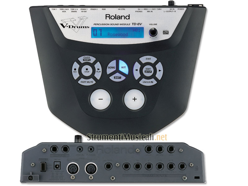 Il modulo TD-6V include 1024 timbri con nuovi kit e pattern completamente riprogrammati, polifonia 64 voci, ed ingressi a doppio trigger per tom che consentono di ottenere il suono del rim su questi ultimi. Il modulo TD-6V è in grado di offrirci i migliori suoni percussivi Roland e 64 note di polifonia. Il sequencer a 6 parti ci permette di programmare facilmente le nostre user song; possiamo inoltre intervenire sui suoni grazie ad un equalizzatore a due bande e un ambience effect. Ben 99 drum kit e tantissime preset song su cui suonare fanno del TD-6V il modulo ideale per chi studia e desidera esercitarsi su un numero eccezionale di ritmi.
