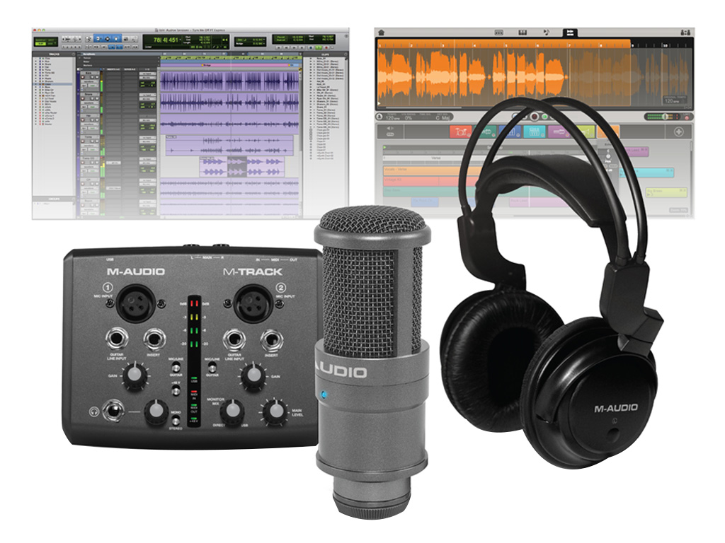 • Interfaccia M-Audio M-Track, microfono a diaframma largo, cuffia, Avid Pro Tools Express con iLok USB key, Ignite by Air (download), Mic clip, cavo XLR, cavo USB