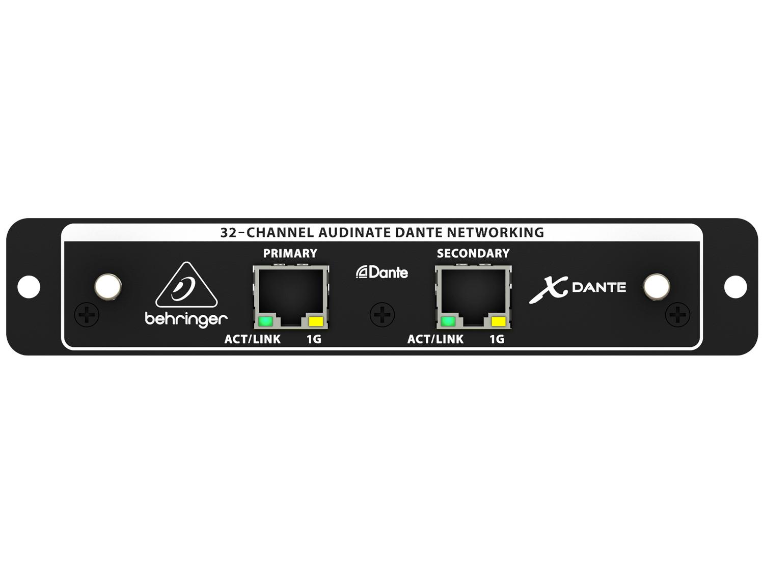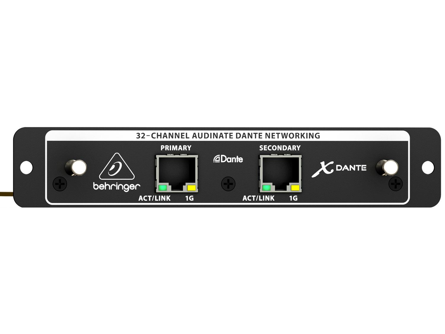 L'X32 viene fornito con una scheda X-USB nello slot di espansione ma, installando la scheda X-DANTE nel suddetto slot, il mixer si interfaccia con le reti Dante utilizzando sia infrastrutture di rete standard 100Mbit o Gigabit con QoS basato su DSCP, con supporto per frequenze di campionamento e di bit rate misti sulla stessa rete. La scheda X-DANTE utilizza la trasmissione del segnale a 24 bit con sincronizzazione sample-accurate e bassa latenza, garantendo la massima integrità audio. Un ingresso secondario consente di impostare una rete ridondante, senza soluzione di continuità. Il controllo remoto completo dell'X32 è possibile utilizzando lo switch Ethernet integrato. Quando la scheda X-DANTE è collegata ad un computer, l'applicazione Dante Controller di Audinate dà il pieno controllo della configurazione e della trasmissione del segnale tra i dispositivi abilitati a Dante.
