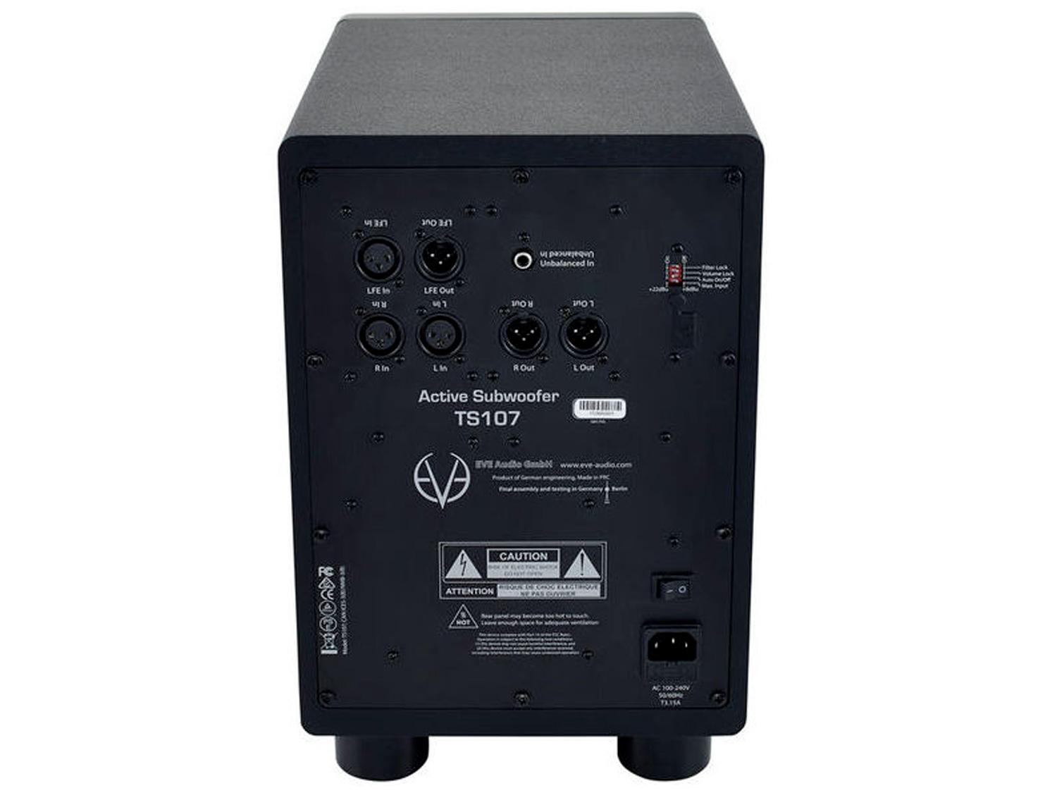Tutti i subwoofer ThunderStorm hanno minuziosi comandi come filtri dei satelliti commutabili (full range e 80Hz), switch di fase (0°, 180°) e frequenza dei filtri subwoofer variabile (60 - 140Hz) per regolare il vostro ThunderStorm a misura di uno specifico ambiente. Il TS107 è il modello più piccolo della gamma dei subwoofer EVE audio e dispone di un amplificatore PWM da 100W molto efficiente che spinge un Woofer proprietario da 6,5​​". Ciò garantisce una risposta in frequenza da 36Hz fino a 300Hz, per una potenza massima di 102dB (SPL @ 1m). Il telecomando in dotazione consente di regolare non solo il volume del subwoofer, ma anche il volume del sistema stereo completo, stando comodamente seduti nella vostra posizione ottimale. Come tutti i subwoofer EVE Audio, è dotato di ingressi e uscite XLR bilanciate (Stereo In e Out, LFE in, LFE/Sub out) per una maggiore comodità.