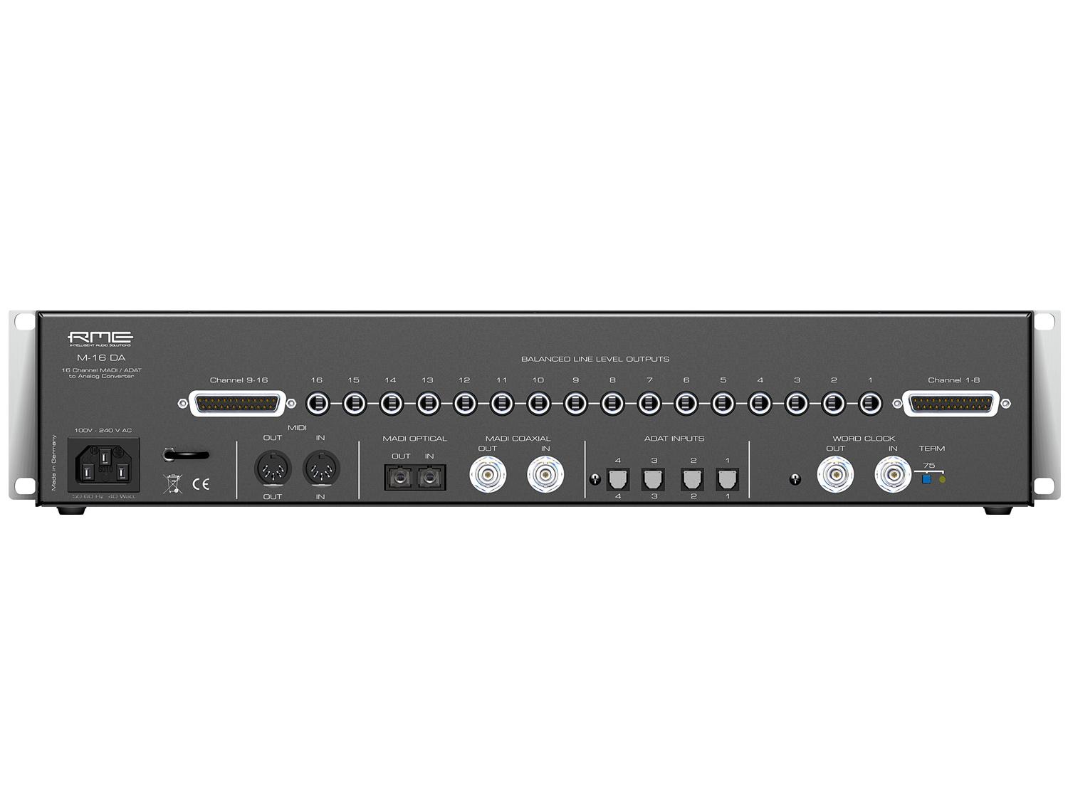 L'RME M-16 DA è un convertitore DA di fascia alta a 16 canali, facile da usare ma con un set di funzionalità completo. L'unità combina circuiti analogici di eccellente progettazione con gli ultimi chip convertitori e lo SteadyClock superiore di RME, con un conseguente conversione state-of-the-art DA - 16 volte! L'insieme unico di caratteristiche dell'unità include limitatori analogici, tre livelli di riferimento hardware fino a +24 dBu, MADI e ADAT I/O fino a 192 kHz, ingressi TRS 6,3 millimetri e D-sub, controllo remoto via MIDI, e il funzionamento in una vasta gamma di tensioni di rete, il tutto racchiuso in un formato 2U. Un limiter straordinario, ideato e ottimizzato per studi professionali, stage e applicazioni broadcast, offre l'indispensabile sicurezza operativa con la sua capacità di limitare il sovraccarico di un ingresso fino a 17dB senza distorsione udibile (livello di ingresso max +30dBu). L'M-16 DA amplia la linea MADI di RME con la conversione multicanale in qualità di riferimento - ad un imbattibile rapporto prezzo / prestazioni!