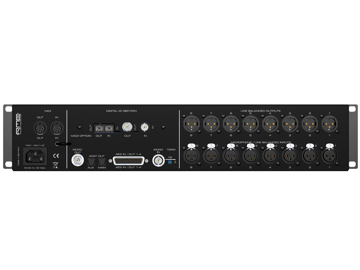 • Uscite digitali: connettori D-sub per 4x AES/EBU fino a 192kHz (più 1 input AES come sorgente sync) Doppio ADAT per 8 canali a 96kHz