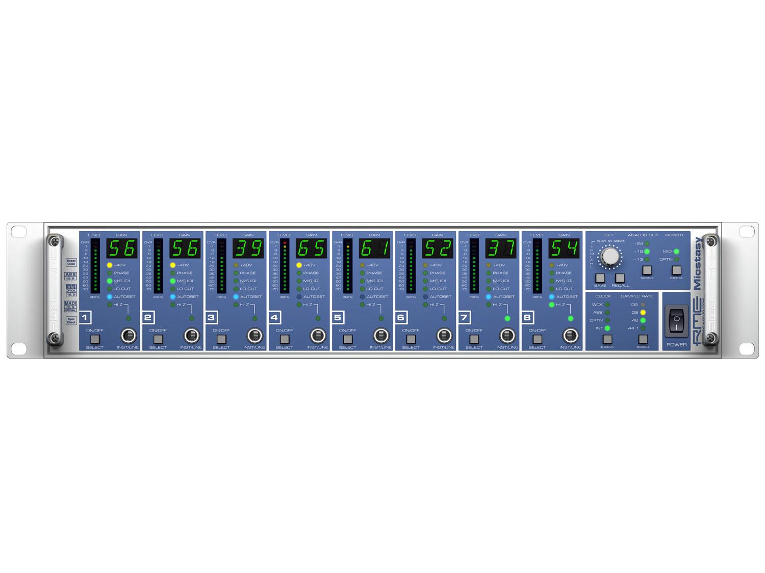 Micstasy è un preamplificatore mic/line hi-end ed un convertitore AD a 8 Canali che unisce tipiche caratteristiche RME con una serie di funzionalità inedite. Può essere usato in modo analogico ( Mic/Line In - Line Out ) e digitali ( Mic/Line In - Digital Out ), con entrambi i percorsi di segnale in funzione contemporaneamente. In aggiunta il dispositivo è completamente controllabile in remoto via MIDI (anche MIDI over MADI). Lo schema innovativo della Micstasy consente l'amplificazione e la digitalizzazione di tutte le fonti di segnali analogici. Che si tratti di segnali di alto livello dal palco, tipici segnali da studio, di livello più basso e strumenti ad alta impedenza, dinamici, microfoni a condensatore o a nastro. I segnali amplificati dalla Micstasy sono disponibili presso le uscite analogiche per la trasmissione rendendo un costoso splitter-box sul palco obsoleto. Tutte le funzioni possono essere controllate a distanza via MIDI e MIDI over MADI, consentendo al dispositivo di essere collocato in prossimità dei microfoni e garantendo massima qualità del suono. Aggiungendo una schede MADI opzionale si ottengono ancora più opzioni. La I64 MADI card 8 (non inclusa) fornisce una funzionalità pass-through seriale da un Micstasy all'altro (fino a 8). Tutti i 64 segnali audio sono quindi disponibili sull'ultimo dispositivo su una singola linea.