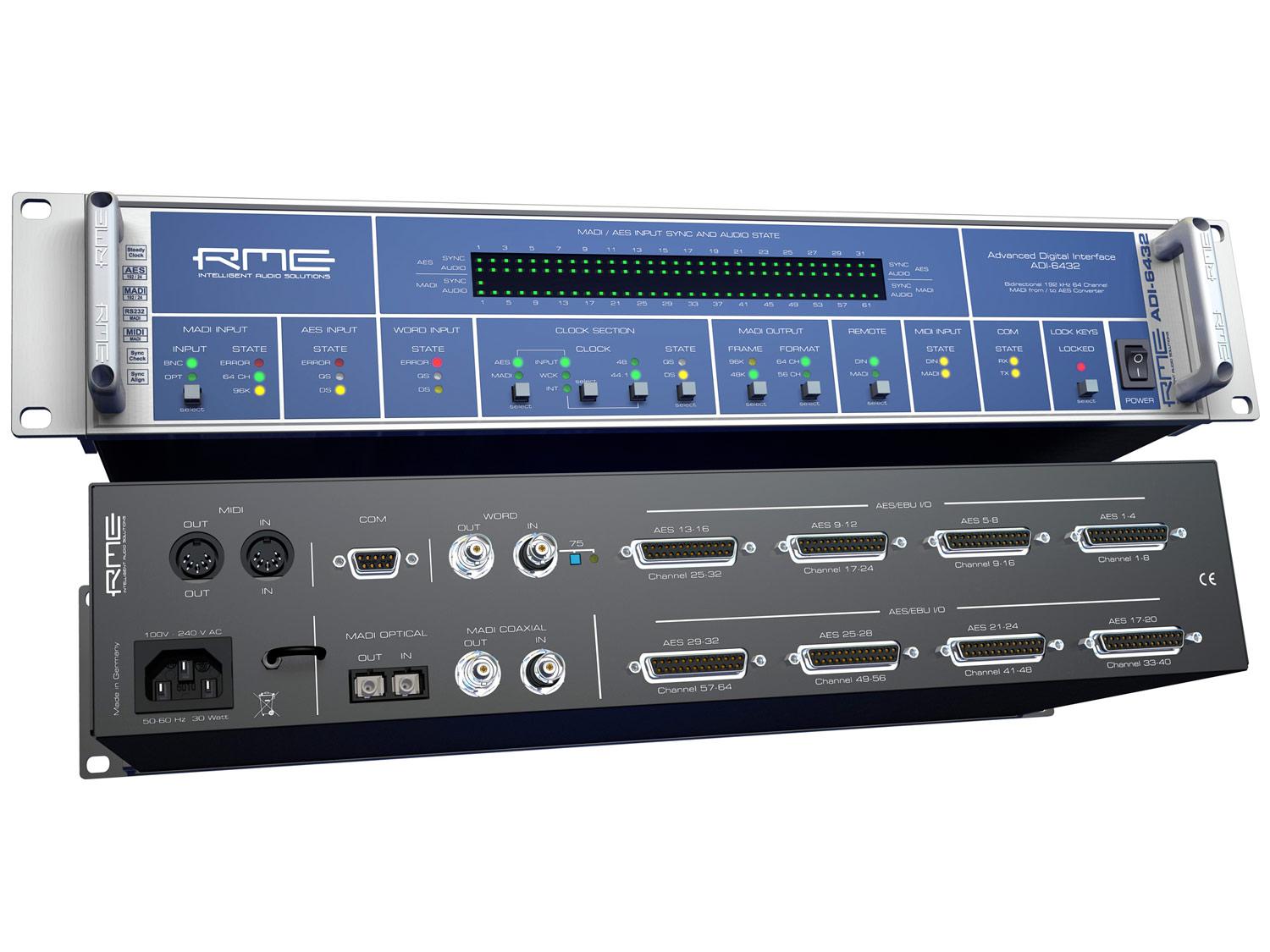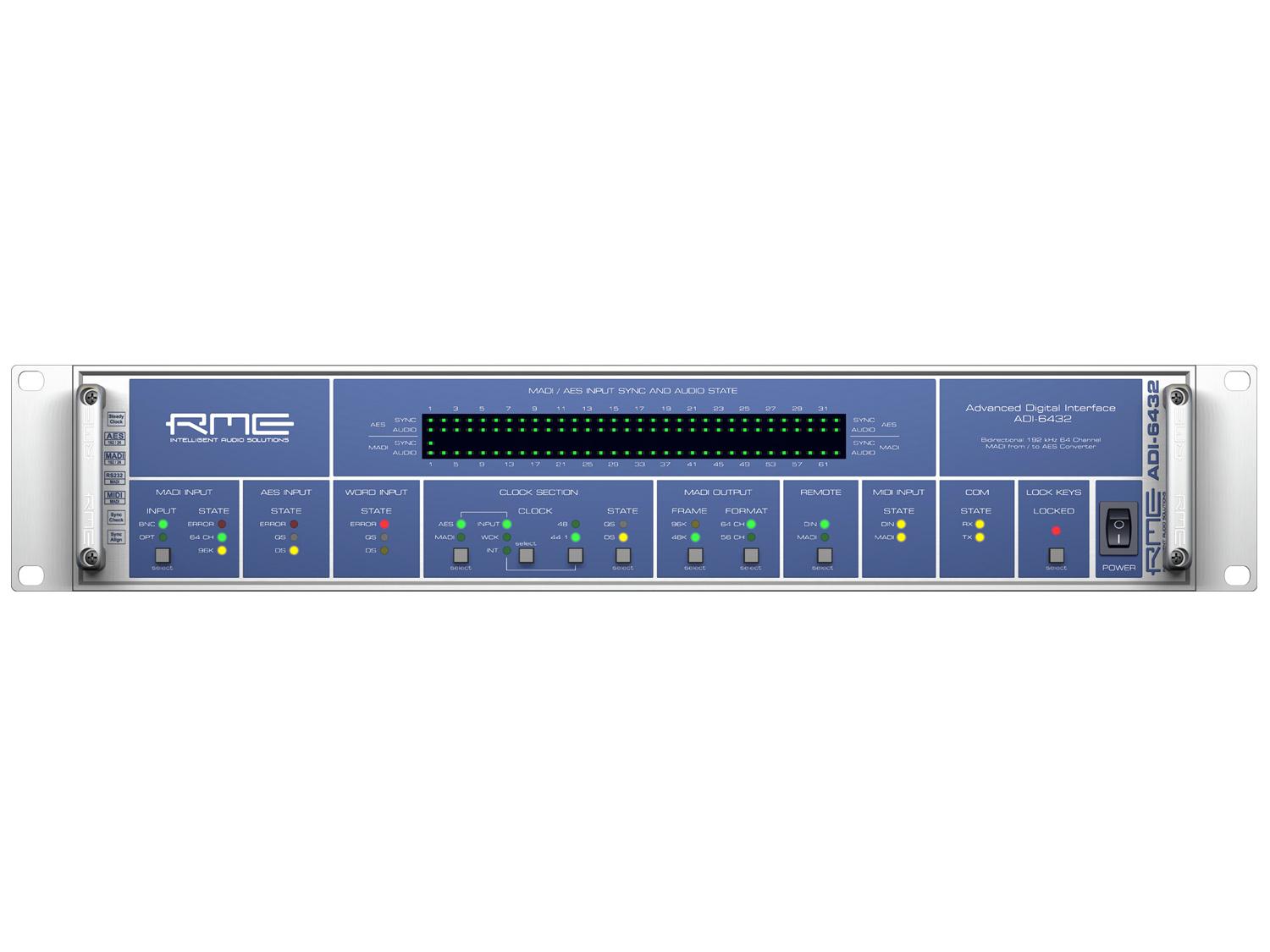 RME ADI-6432 offre 64 canali di conversione da MADI a AES e viceversa. Le applicazioni tipiche includono due ADI-6432 usate come multicore digitale, o una unità utilizzata come AES / EBU front-end per la scheda PCI Hammerfall DSP MADI. Supporta sino a 192 kHz a 24-bit ed ha un formato di 2 unità rack affinchè ci sia abbastanza spazio per tutti i connettori e gli elementi di comando. MADI gestisce 64 canali audio a 24 bit ad una frequenze di campionamento fino a 48 kHz, 32 canali fino a 96 kHz e 16 canali fino a 192 kHz. Tutti i canali sono trasferiti attraverso un cavo singolo, sia coassiale (BNC) che di rete ottica. In entrambi i casi, si possono usare cavi di lunghezza fino a 100 metri. I canali AES / EBU sono forniti come 32 ingressi ed uscite AES / EBU tramite connettori D-sub. L'ADI-6432 accetta 56 e 64 canali così come 96k frame all'ingresso, e può essere impostata per generare questi formati in uscita.