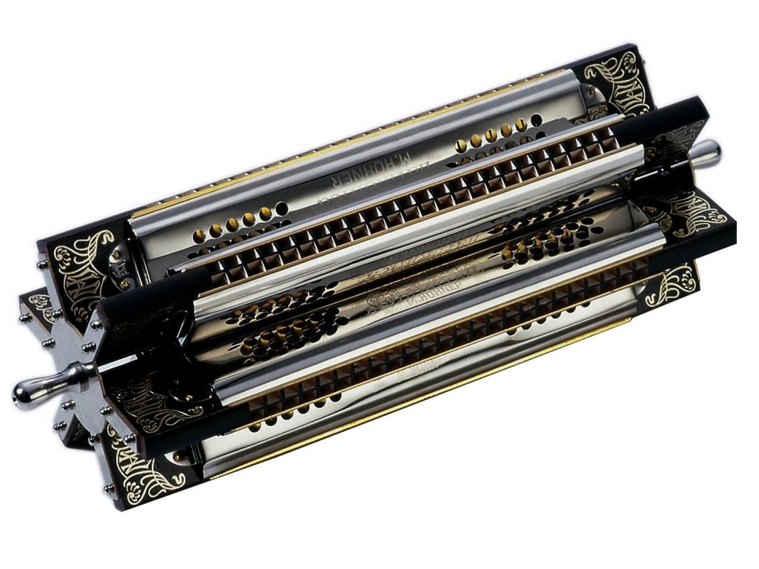 Se vuoi davvero davvero esagerare a volte hai bisogno di un pò di più. Il Kreuzwender Sextuple, l'armonica tremolo più grande del mondo, comprende un set di sei strumenti in tutte le tonalità più popolari, tenuti insieme come una ruota a pale da impugnature a forma di stella a sei punte alle estremità, in modo che il musicista possa ruotare l'intero strumento per cambiare tonalità, tenendolo con entrambe le mani. Sia che tu suoni in un ensemble di armoniche o da solo, con questa straordinaria esclusiva di Honer puoi quasi sentire l'acqua fresca di montagna che scorre intorno alle dita dei piedi.