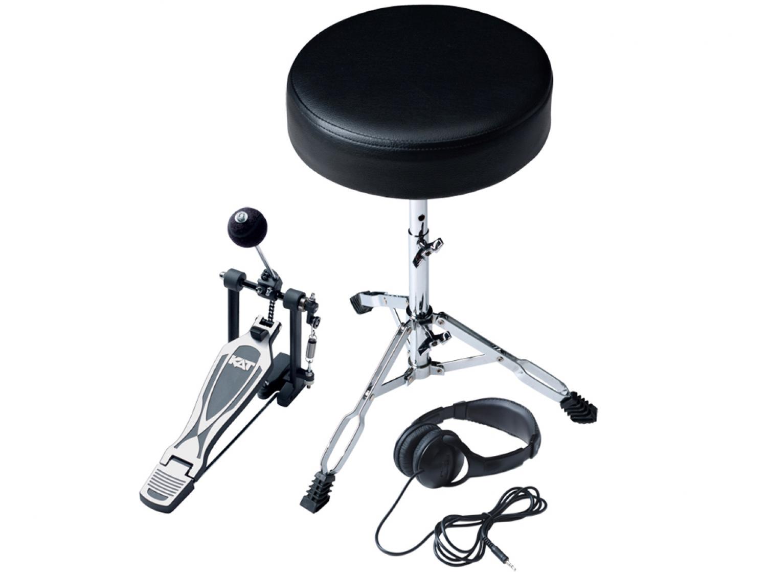 Il pacchetto di espansione KT2EP4 ti dà tutti gli articoli che vorrai aggiungere per iniziare a godere appieno del tuo kit di batteria digitale KAT. Questi accessori funzionano con i drum kit digitali KAT KT1 e KT2. Il pedale per grancassa KTSP1 presenta il logo KAT per abbinarsi al controller Kat Hi-Hat e comprende il battente per grancassa KAT "Silent Strike". Il seggiolino ha gambe a doppia staffa e le cuffie stereo sono ben imbottite per le lunghe sessioni di musica.