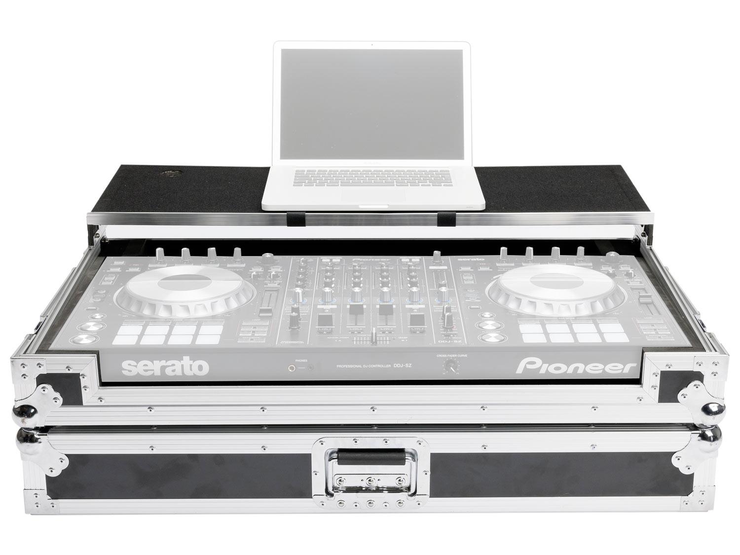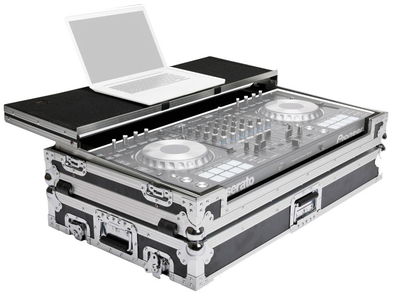 Flight case in grado di contenere un set composto da controller table top tipo PIONEER DDJ SZ oppure NUMARK NS7II. Questo modello impiega un piano rialzato a slitta per posizionare laptop ed altri dispositivi. Grazie al particolare disegno dello chassis questo modello permette di trasportare il materiale già installato senza alcun rischio durante il trasporto.