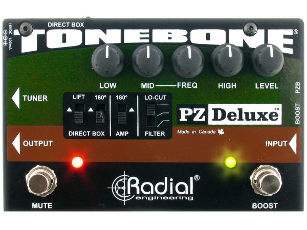 Il Radial PZ-Deluxe è un preamplificatore di qualità da studio per strumenti che ha raggruppa una serie completa di funzioni in un pedale compatto per l'uso live. E come la maggior parte dei preamplificatori da studio, il PZ-Deluxe inizia con un front-end a basso rumore che è capace di dinamiche eccezionali per adattarsi a tutti gli strumenti, tra cui chitarra acustica, contrabbasso, mandolino e violino, non importa quale tipo di sistema di pick-up viene utilizzato. Per i trasduttori piezoelettrici, uno speciale stadio di guadagno PZB può essere attivato per aumentare l'impedenza di ingresso di 10 meg-Ohm per eliminare squawk ed picchi esplosivi che sono comuni con altri sistemi. Questo elimina la necessità di un preamplificatore separato - che è di particolare importanza per coloro che non vogliono fare un foro nella propria chitarra vintage.