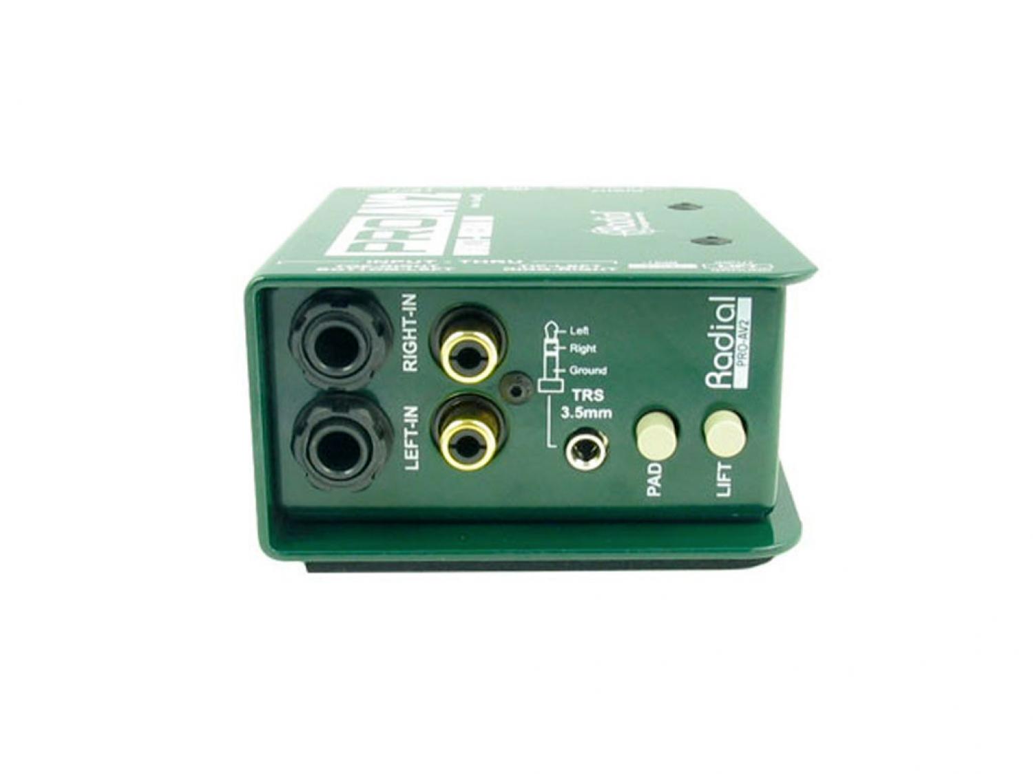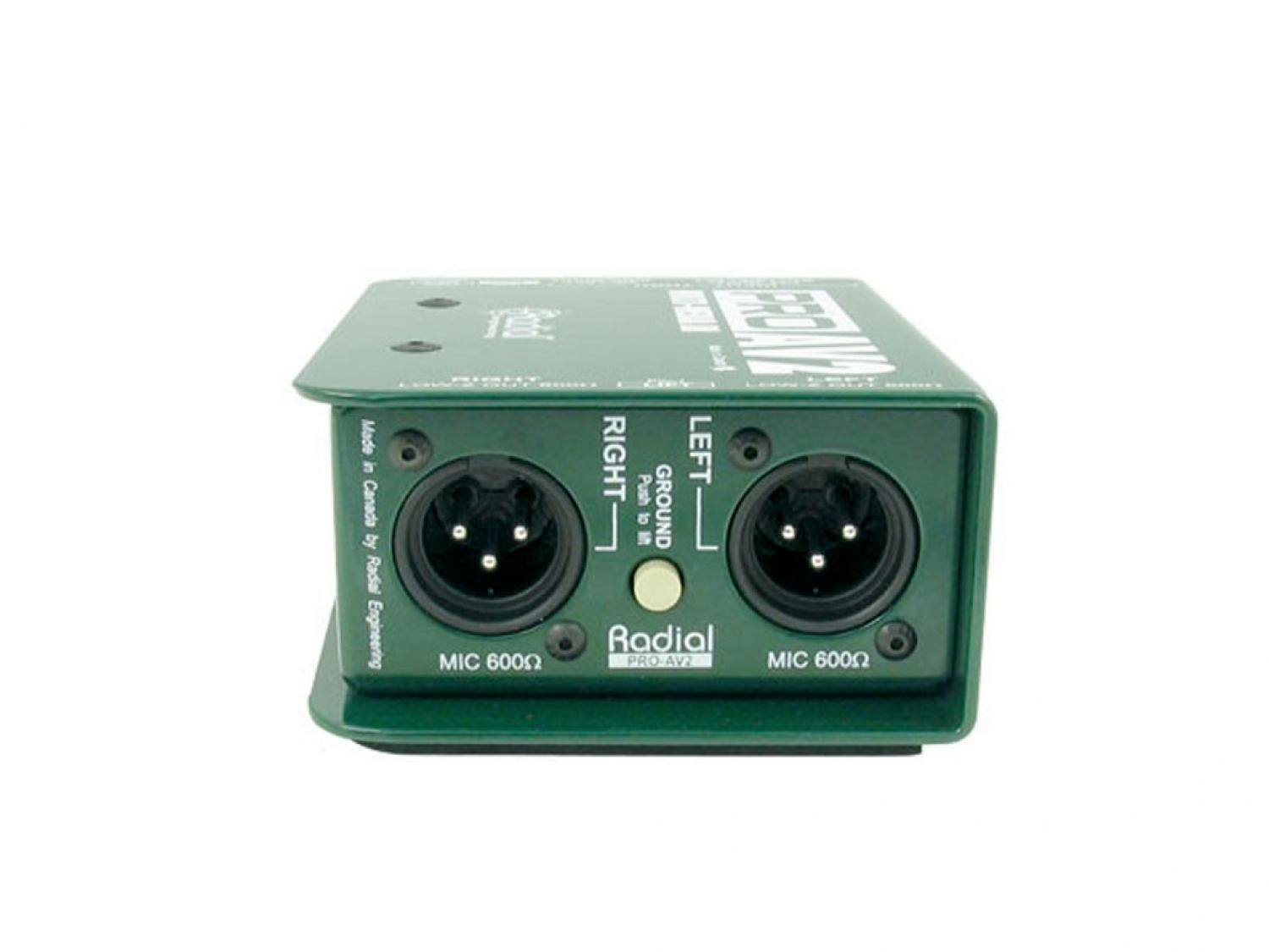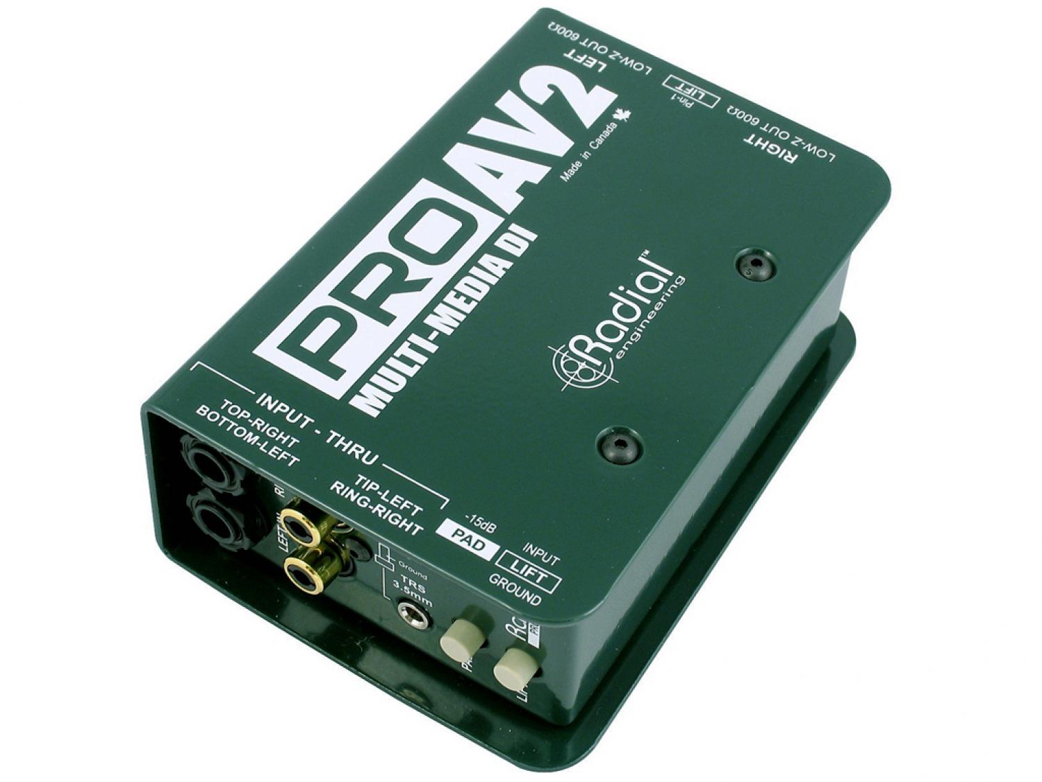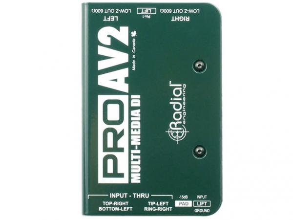Il Radial ProAV1 e ProAV2 sono direct box passive sviluppate specificamente per l'integrazione audio-video. Il ProAV2 offre due canali discreti dove si richiede una funzionalità stereo completa. Per eliminare la necessità di diversi adattatori, entrambe le unità sono dotate di una serie di opzioni di connettività "Swiss Army" tra cui ingressi 1/4" per strumenti, RCA e connettori 3,5mm (1/8") per lettori CD, iPod, videoregistratori e computer. Trasformatori con avvolgimenti custom Eclipse ET-DB2 sono in grado di resistere a livelli di segnale eccezionalmente violenti mantenendo la linearità da 20Hz a 20kHz. La curva di Bessel piatta risultante è calda e naturale, rendendoli particolarmente abili a gestire sorgenti digitali con suono aspro. I trasformatore di isolamento danno benefici ulteriori eliminando hum e buzz causati da loop di massa o problemi di offset DC.