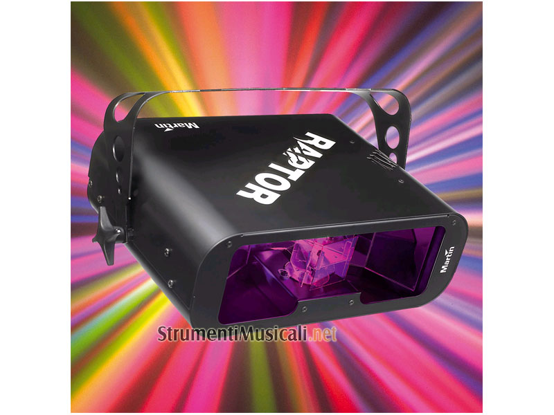 The Raptor is a powerful mid-air performer that creates a dynamic, eye-catching show with more than 70 ever-changing light beams. Read more Small and lightweight…but deceptively fast and powerful, the new Martin Raptor lives up to the wild, aggressive reputation of its Jurassic namesake. With the Raptor, Martin has given real teeth to the DJ lightshow. More than 70 razor sharp light beams slice through the air, constantly changing color and direction to the intensity of the music. The Raptor has more power. It employs a 250 watt halogen lamp to give unrivalled brightness for a unit of its compact dimensions. And it's always ready when you need it. A built-in high speed cooling fan ensures the Raptor is ready to rip all night long